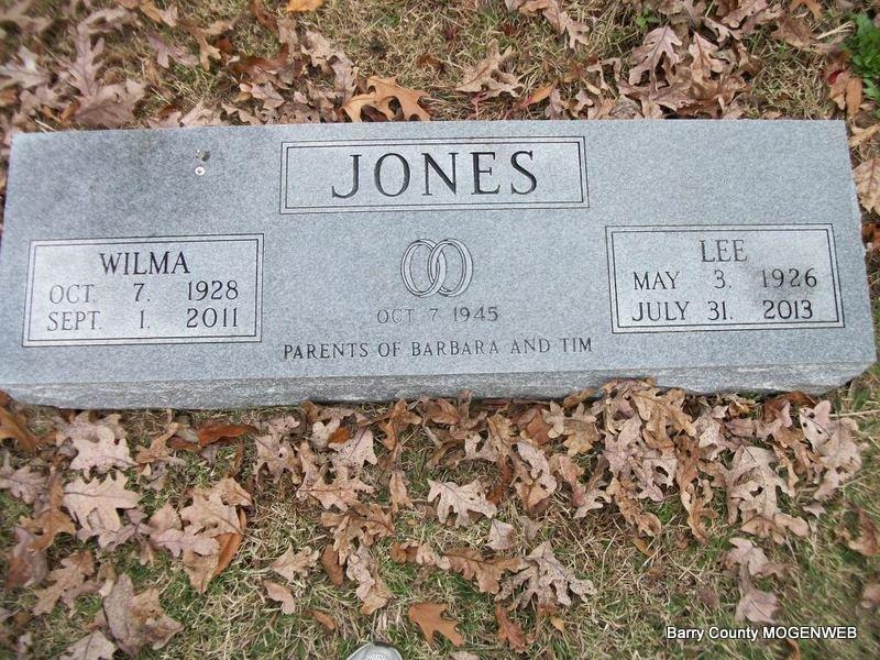 SSW: Wilma - Inscription: "Married Oct. 7, 1945 - Parents of Barbara and Tim" - Research Note: He was the son of Clint and Nina (Babbs) Jones. On October 7, 1945 he was united in marriage to Wilma Williams in Noblesville, Indiana. She preceded him in death on September 1, 2011. Their love for Roaring River brought them to Cassville where they owned and operated Roaring River Resort for several years before retiring. In addition to his wife, he was preceded in death by seven brothers, and two sisters. | White Funeral Home Phyllis Long Photo Diana Cope |