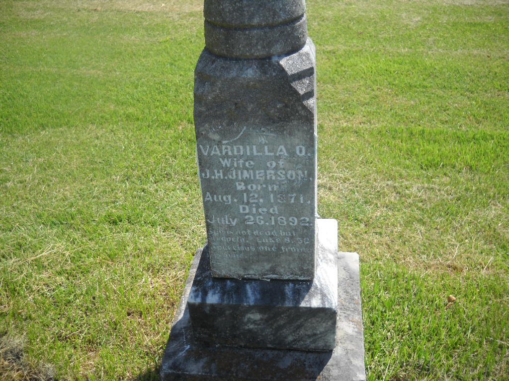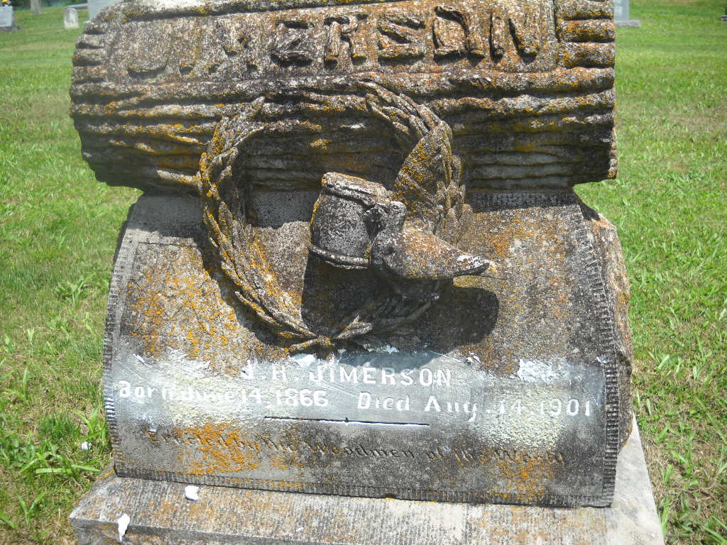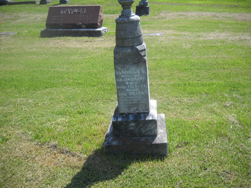 Research Note: This stone is barely readable. Son of Caleb M. Jimerson and Mary Ann Grubbs. His first wife was Vardilla. 1900 Census, his wife is Fanny. - John H. Jimerson, age 31, married Fannie Barcus, age 19, on Jan. 16, 1898 in Barry Co., MO. - Vandilla O. Craig married John H. Jimerson on May 22, 1890 in Barry Co., MO. - 1900 Census, Flat Creek Twp., Barry Co., MO - JIMERSON, John H., head, M, June 1866, 33, M, 2, AR TN TN; Fanny, wife, F, Jan. 1879, 21, M 2, 1-1, IL IN IN; Lula M., dau, F, Jan. 1891, 9, S, MO AR IN; Sherman D., son, M, Sept. 1898, 1, S MO AR IL. | Census MO Marriage Records Phyllis Long Photo BCG and HS |
