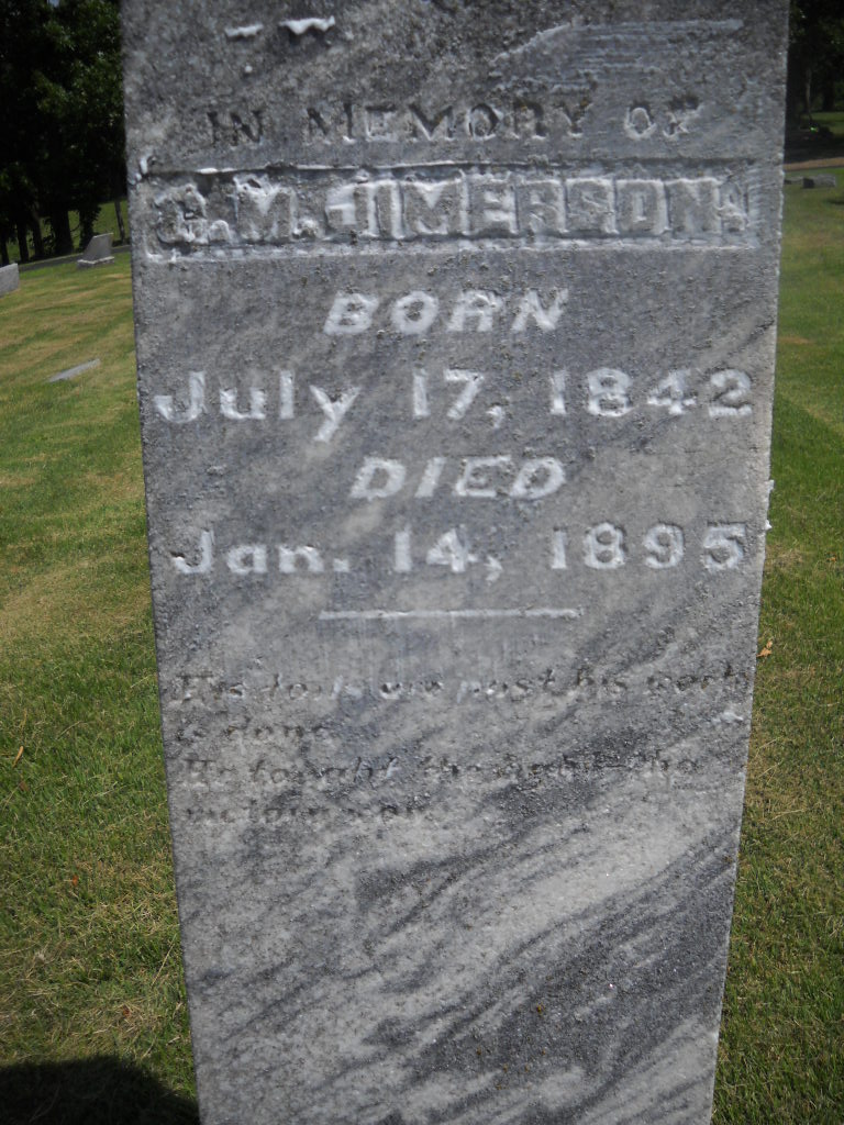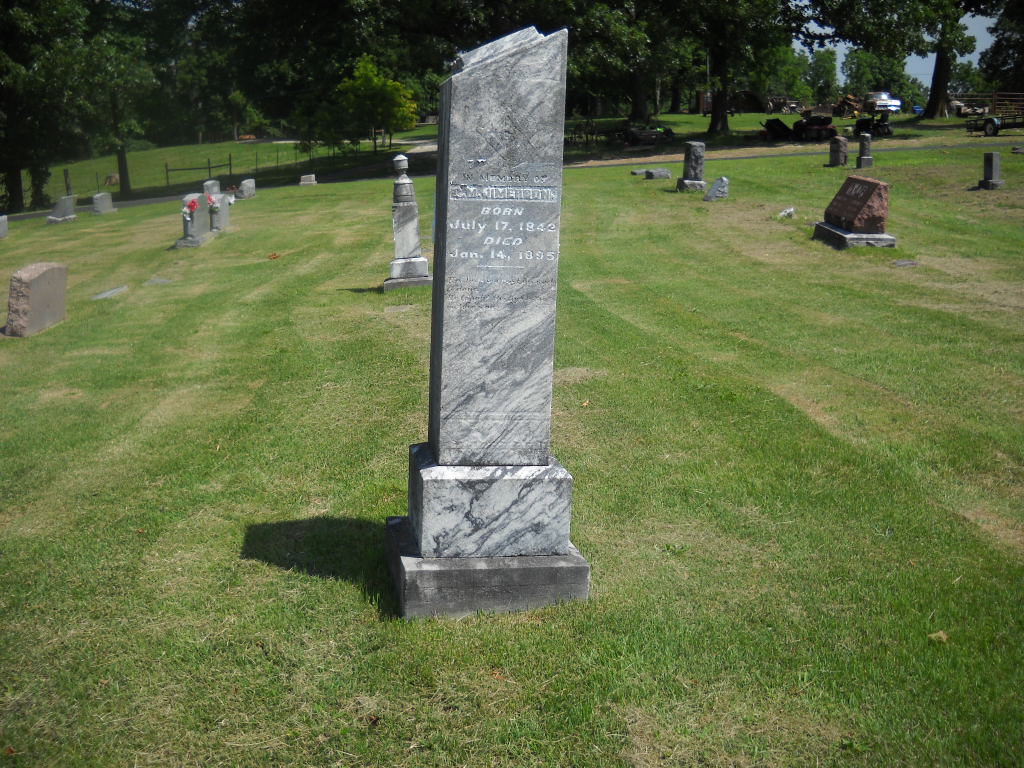 SSW: M. A. - Research Note: Son of Jason Jimerson and Lucinda Carter. Cheryl's Note: He married Mary Ann Grubbs daughter of Loyes and Catherine (Tucker) Grubbs. - Cassville Republican, January 17, 1895 - Caleb M. Jimerson was born in Bradley Co., Tennessee, July 17, 1842, and came to Barry County from Arkansas in 1870, since which time he lived near Cassville. Services were conducted at the Union Church, Tuesday, by Rev. J. W. Ennes, after which the remains were interred in the Cassville Cemetery under the auspices of Pythagoras Lodge No. 338, A. F. and A. M., of which lodge the deceased was a member. The deceased was a consistent member of the M. P. Church and died in full faith of a future salvation. - Civil War Veteran: Pvt., Co. K, 1rst AR CAV, enlisted on June 29, 1864, discharged Aug. 23, 1865. - Another Photo | Online Obit Darla Ball Marbut Photos BCG and HS 1890 Vet. Census Census Phyllis Long Note Cheryl |