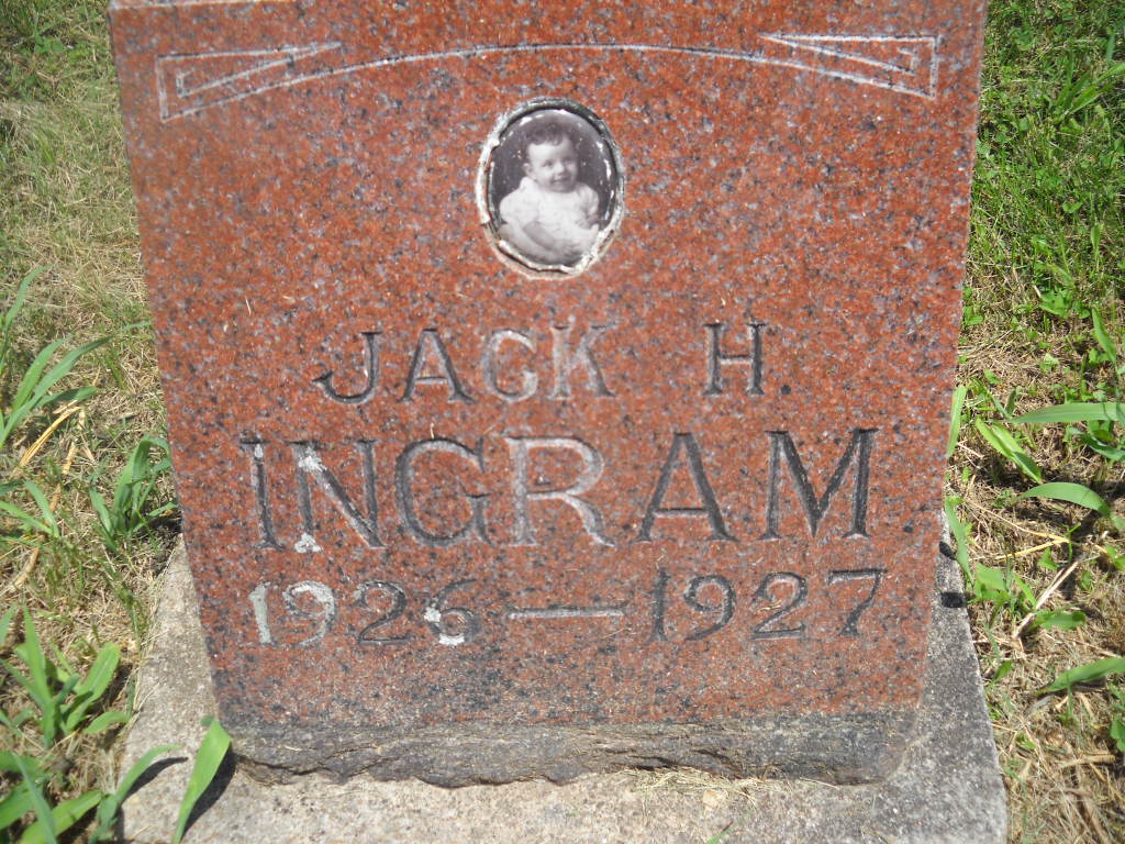 Research Note: The stone has his photo on it. His death certificate reads that his father was John S. Ingram, born MO, and his mother was Gladys Horine. It reads that he was 1 year and 8 days old when he died but gives no date of birth. Cholera Infection was the cause of death. J. S. Ingram, Cassville, MO, was the informant. | Photos BCG and HS Death Certificate Donna Cooper |