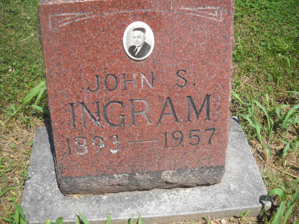 1957 | Research Note: The stone has his photo on it. Kay's Note: John married Gladys Horine. He was a son of Martin Lewis Ingram, born MO and Mary Lillian Brashears/Beshears. 1930 census gives John and Gladys Ingram in Barry Co., MO, with daughter, Mary, age 1. John was a dentist. - March 23, 1916, Thursday, Cassville Republican - Personal and Local News: Rollin Ingram of Monett spent the first of the week with his brother, Dr. J. S. Ingram. Rollin is attending a dental college at Kansas City and is at home for a week's vacation. - Cassville Republican, July 10, 1919 - Dr. J. S. Ingram returned Sunday after an absence of a week on account of the illness of his father. He accompanied his father to a Kansas City hospital and remained with him there until Friday when he was brought to the Springfield Hospital. He is reported to be improving. Mrs. Ingram is also ill and at the Springfield Hospital. | Headstone Kay Baker Cardin Stephens Family Genealogies 1690-1938 Online Newspapers Phyllis Long Photos BCG and HS |
