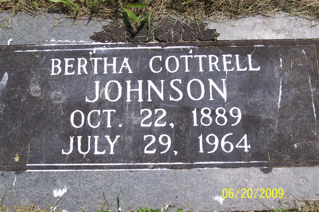 | JOHNSON, Bertha (ETHRIDGE) (COTTRELL) | Oct. 22, 1889 | July 29, 1964 | Research Note: Daughter of Commadore Perry Ethridge and Nancy Harris. Bertha Ethridge married Silas J. Cottrell on Jan. 30, 1910 in Barry Co., MO. Still widowed in the 1940 census. | MO Marriage Records Census Phyllis Long Photo BCG and HS |