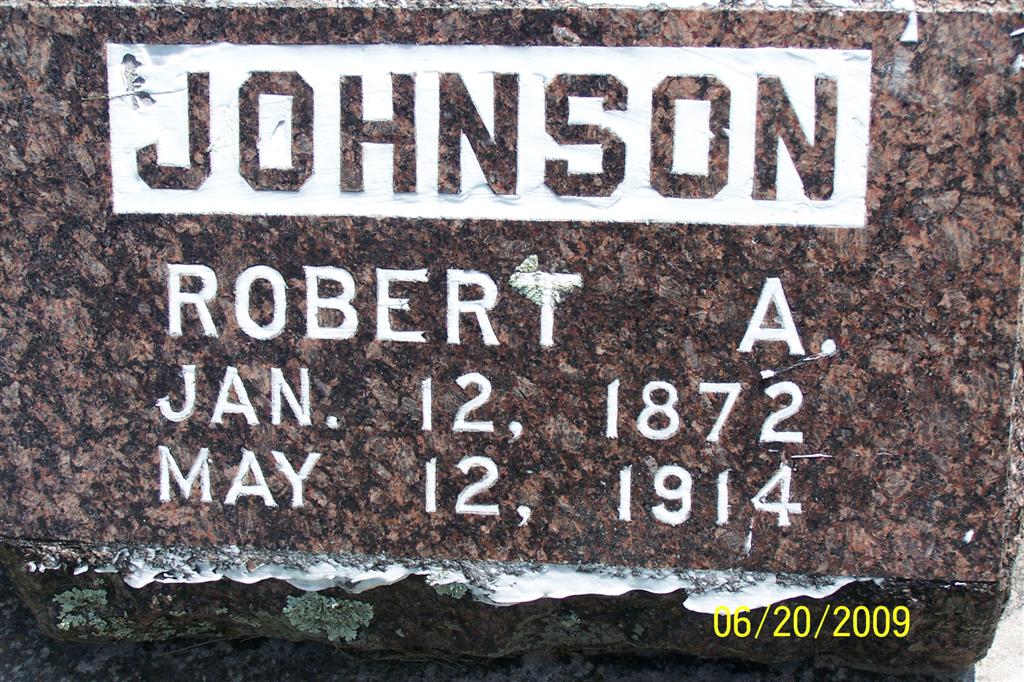Research Note: He was a conductor on the Cassville and Western Railroad and married according to his death certificate. He was a son of J. T. Johnson and Mary J. Holt. Mellie Johnson was the informant. Robert A. Johnson, age 22 married Mellie Smith, age 22, on July 25, 1894 in Purdy, Barry Co., MO. - Cassville Republican, May 21, 1914 - Burial of Robert A. Johnson: The remains of Robert A. Johnson, who died at Joplin, Tuesday, May 12, 1914, arrived here Wednesday evening for burial. Interment was made Thursday afternoon at the Oak Hill Cemetery, after short funeral services conducted by Rev. E. A. Frost assisted by Rev. Hickman. The deceased was a son of Mr. and Mrs. J. T. Johnson of Wheaton, and was born at Washburn, January 12, 1872. He lived in the county a grater part of his life and had wide acquaintances. For several years he was conductor on the Cassville and Western Railroad and was the first employee to fill that position. During the past few years he became afflicted with paralysis in which his life was gradually taken. He was a member of the Christian Church and bore his affliction with Christian fortitude. Besides his parents, the deceased is survived by a wife, three children, six brothers and one sister. - June 24, 1897, Cassville Republican - Mrs. Lewis Smith, who had been visiting her daughter, Mrs. R. A. Johnson, returned Friday to her home near Purdy. - Nov. 18, 1897, Cassville Republican - Albert Johnson and Miss Ona Jeffries of Corsicana were untied in marriage at the former's brother's R. A. Johnson, at the C. and W. depot, Thursday. Eld. E. A. Frost officiating. | Online Obit Death Certificate Online Newspapers MO Marriage Records Phyllis Long Photo BCG and HS |