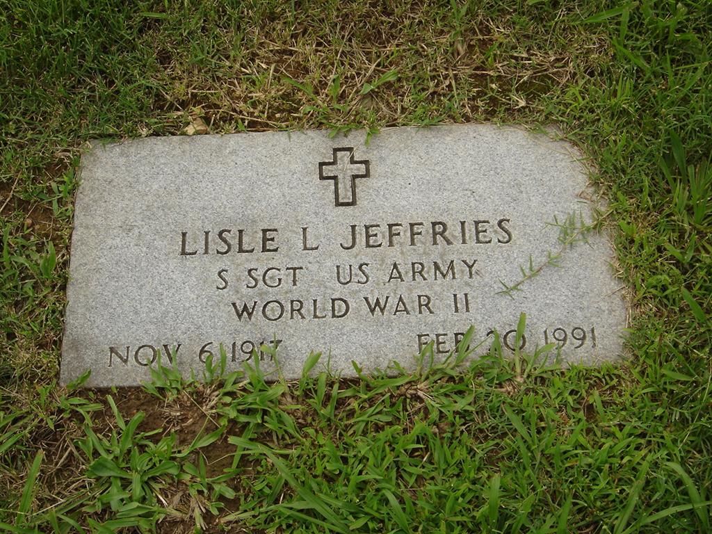Feb. 20, 1991 | SSW: Charlene - Research Note: Son of Cass Jeffries and Cora E. Huff. - Military Stone - Inscription: "S SGT US ARMY WORLD WAR II" | SS Claims Index Phyllis Long Photos BCG and HS |