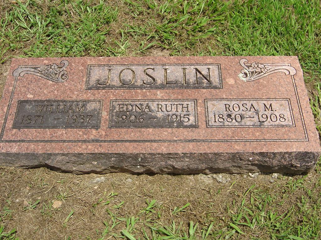SSW: William and Rosa M. - Research Note: She was a daughter of William W. Joslin born Barry Co., MO and Rosa Dell Morton, born Cowley Co., TN. The cause of death was an accident, killed by mashing concussion of spinal cord. - June 10, 1915, Thursday, Cassville Republican - Seven Year Old Child seriously Hurt in Father's Carpenter Shop: Ruth, little seven year old daughter of Will Joslin, was seriously injured Friday afternoon at her father's carpenter shop in the west part of town. While picking up shavings on the floor of the shop, her clothing was caught by a line shaft in rapid motion from gasoline power, and she was hurried about the shaft until all her clothing was torn from her body and she was left unconscious on the floor before her father who was busy at a turning lathe knew what had happened. The grief stricken father and grandmother at once called physicians who found the little child in a very critical condition. Her body was badly bruised and the bone of the upper right arm was broken. Examination indicated every serious internal injuries especially of the spine and nervous system. Mr. Joslin has his carpenter shop equipped with gasoline power and was busily engaged Friday afternoon on work which was necessary to have the engine in operation. His mother, who makes her home with him and had asked Ruth to bring her some shavings from the shop with which to start a fire for preparing supper. Ruth entered the shop, which is close by the house, unnoticed by her father. She not realizing the danger, went too close to the moving machinery and her clothes were caught resulting in the sad accident. Physicians gave the case the very closest attention and they express little hope of her recovery. - June 17, 1915, Thursday, Cassville Republican - Little Ruth Joslin Dead: Living twelve days after being so seriously injured by the machinery in her father's carpenter shop, little Ruth Joslin died Tuesday evening at 6:45 o'clock. | Online Newspapers Death Certificate Phyllis Long Photo BCG and HS |