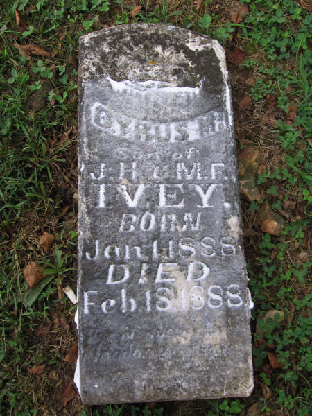 | IVEY, Cyrus M. | Jan. 1, 1888 | Feb. 18, 1888 | Inscription: "Son of J. H. and M. F." - Research Note: Son of John Henry Ivey and Mary Frances Jones. | Note Phyllis Long Photo BCG and HS |