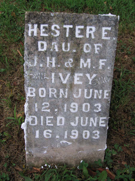 | IVEY, Hester E. | June 12, 1903 | June 16, 1903 | Inscription: "Dau. of J. H. and M. F." - Research Note: Daughter of John Henry Ivey and Mary Frances Jones. | Note Phyllis Long Photo BCG and HS |