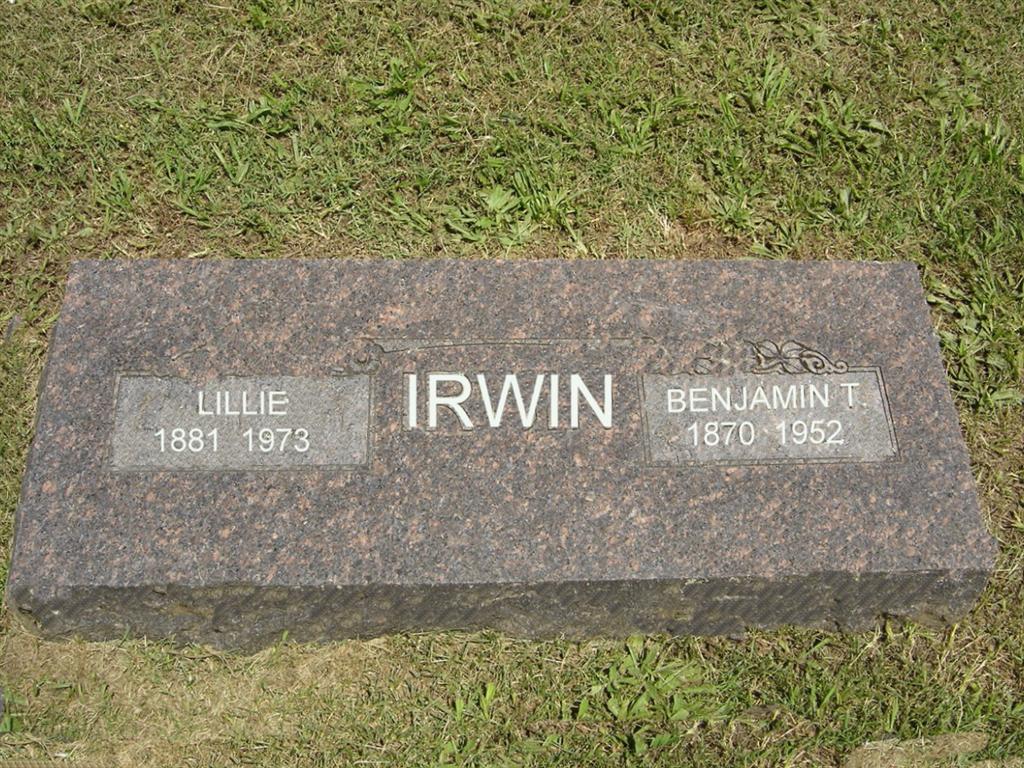 SSW: Lillie - Research Note: According to his death certificate his wife was Lillie Irwin. He was a son of William Lanz Irwin and Sarah Elizabeth Daugherty. He was a owner of a hotel and operator. - Wheaton Journal, January 24, 1952 - Benjamin G. Irwin, 81 years old, owner-operator of the Irwin Hotel in Cassville the last 32 years, died at 9:00 o'clock Tuesday night in the Cassville Community Hospital. He had been a patient in the hospital for a week. Mr. Irwin was a life-long resident of Barry County and was widely known. He was one of the leaders of the Democrat party in the county and one of his daughters is Postmistress at Cassville. Surviving are his widow, Mrs. Lilly Irwin; two daughters, Mrs. George Joslin and Mrs. Gladys Smith; two granddaughters, Mrs. Nancy England and Patricia Joslin of Cassville, and a sister, Mrs. Tom Wiles of Afton, Okla. Funeral services are being conducted this afternoon at 2:30 o'clock at the Koon Funeral Chapel in Cassville. The Rev. Chas. Vanzandt of Exeter will officiate, assisted by the Rev. Lee Soxman, Jr. Burial will be made in the Oak Hill Cemetery at Cassville. - Death certificate and stone read Benjamin T., obit has Benjamin G. - Cassville Republican, Barry Co., MO, Thursday, April 5, 1895 - J. T. Ault was before Squire McCary at Washburn, Friday, for exhibiting deadly and dangerous weapons in a rude, angry and threatening manner. The assessment was $50 and costs, which is being paid in the county jail. Ault did not like his sister-in-law, Miss Rosa Haynes, going with B. T. Irwin, and while they, with other young people, were on their way to Pasley, Mr. Ault held them up with a gun and required them to seek home, sweet home. | Online Obit Online Newspapers Death Certificate SS Claims Index Phyllis Long Note Donna Cooper |