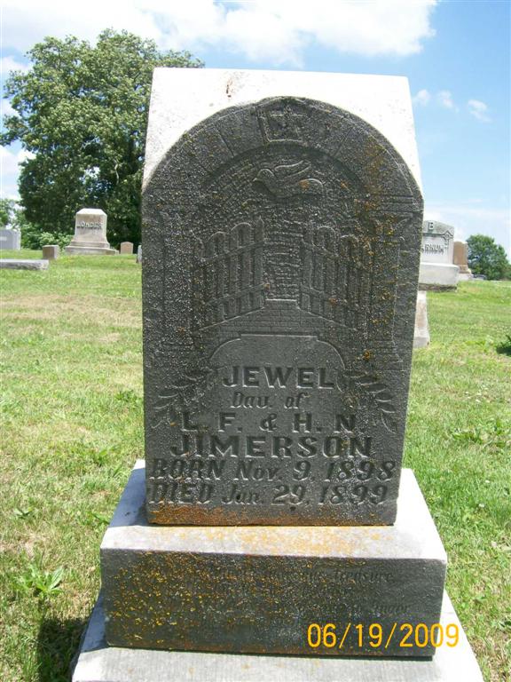 | JIMERSON, Jewel | Nov. 9, 1898 | Jan. 29, 1899 | Inscription: "Dau. of L. F. and H. N." | Photo BCG and HS |