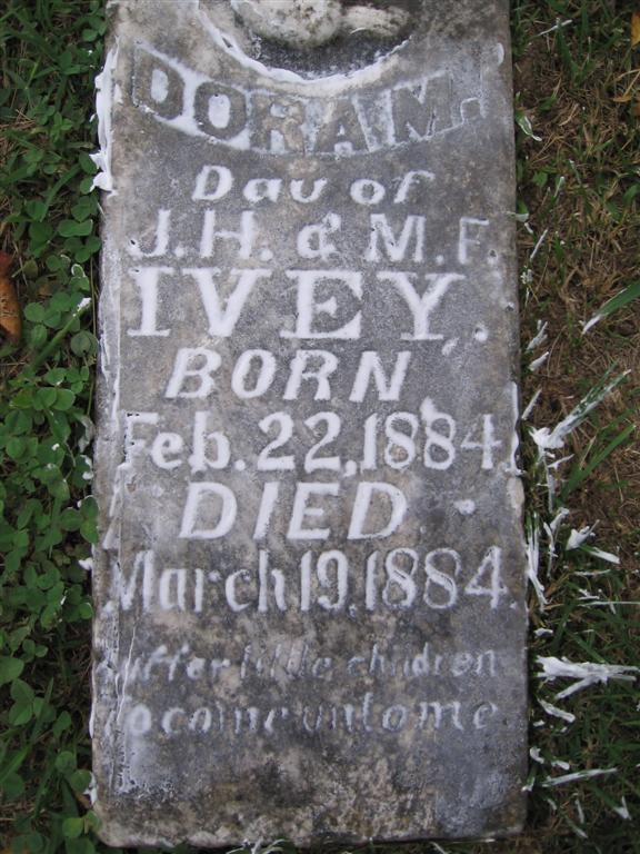 | IVEY, Dora M. | Feb. 22, 1884 | Mar. 19, 1884 | Inscription: "Dau. of J. H. and M. F." - Research Note: Daughter of John Henry Ivey and Mary Frances Jones. | Note Phyllis Long Photo BCG and HS |