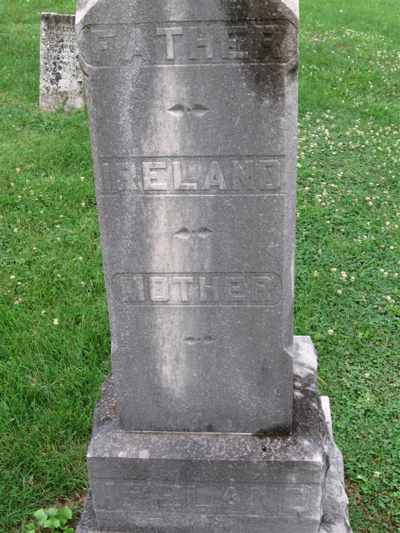 Research Note: Son of Deborah Huffman and William Ireland, husband of Mary Haddock, daughter of Chloe Albritton and Zachariah Haddock. Mary Haddock married, Oct. 25, 1846, to John Ireland in Barry Co., MO. Isaac Crow, J. P., married them. They made their home near Cassville, the county seat of Barry Co., MO, where they built up a fine farm. John was killed by Federal troops at his home in 1862. Mary remained on the farm and reared her children. - Cassville Democrat, April 13, 1907 - Military History of Barry County: John Ireland was called up at the hour of midnight, at his home 1 3/4 miles out on the Roaring River road and shot to death. - Darla Marbut reported: We were always told John Ireland was killed during the Civil War by bushwhackers. It was said he was hiding in a cave near or on what is now Roaring River State Park. There is an old road leading into the northeast end of the park. The dirt road is still in existence today and is Farm Road 1135. This road would have been near the area where John Ireland and Amos Horner lived. The story went that John Ireland was hiding with Amos Horner in the cave. They would come home at night to check on their families. Upon returning one evening John Ireland was killed in front of his family by bushwhackers. His young son, John Christopher Ireland who was 12 years old at the time, ran to Amos Horner's house and warned him that bushwhackers had killed his father. Amos was able to escape. Fredalene Cooper Horner, author of "A Horner Legacy" page 95, gave the name of the man hiding with John Ireland. She relates that Amos Horner joined the Union Army because of this incident. He joined and was a Private in Co. E. Reg't. 2nd Ark Cav. on Sept. 15, 1863. Fredalene Cooper Horner also indicates bushwhackers killed John Ireland. - Back of Stone | Photos BCG and HS Online Newspapers Phyllis Long Family History Darla Ball Marbut |