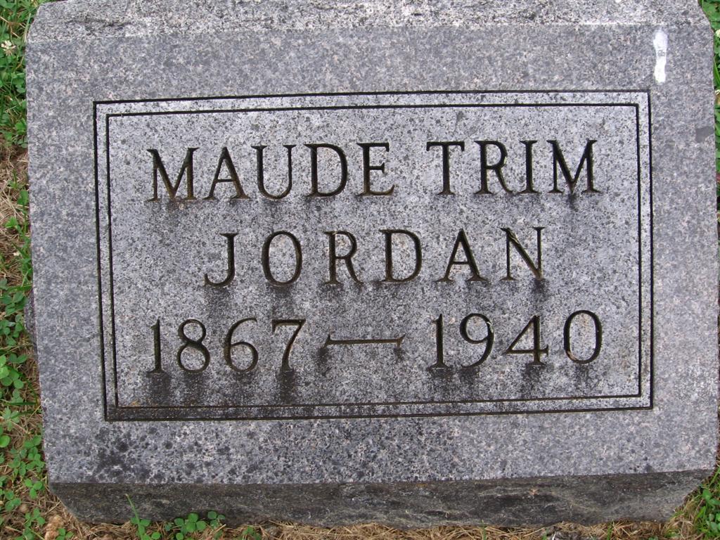 Research Note: Her death certificate reads that her father was John Trim, born TN, and that her mother was Louisa Place, born TN. She was widowed. W. L. Price, Neosho, MO, was the informant. Ira Nickle says that he thinks that Maud Jordan's death certificate is incorrect. It was reported her father was John Trim and her mother was Louisa Place. The January 20, 1917 issue of the Democrat has John Trim's death date as January 20, 1917 and that he was 46 years of age. He would have been born in 1871. Maud Trim Jordan was born on April 17, 1867 in Cassville. William Ellis Trim married Louisa Logan on February 25, 1866. I believe her father was William E. Trim unless there was another John Trim who married a Louisa Place. | Photo BCG and HS Death Certificate Donna Cooper Note Ira Nickle |