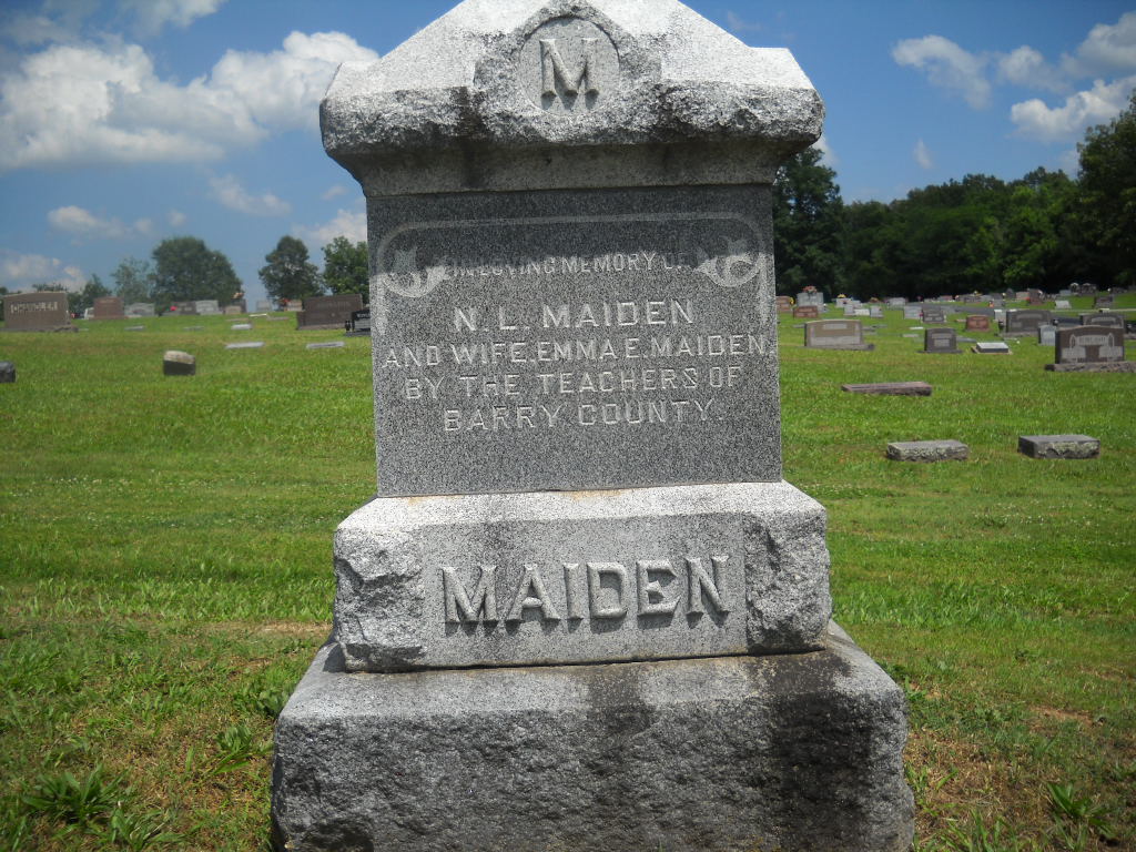 SSW: Emma - Research Note: Goodspeed's 1888 History - Prof. Noah L. Maiden, principal of the Collegiate Institute, of Cassville, MO, and school commissioner of Barry Co., is a native of Abingdon, Washington Co., VA, born in 1844. He is a son of John Maiden and Susan Landis, both of German extraction. Sometime during the 17th century, three brothers, John, William, and Jacob Maiden, emigrated to the US from England, and settled in the Shenandoah Valley, VA. It is from this stock that John Maiden descended. He was born in Augusta Co., VA, in 1797, and after his marriage removed to Washington Co., VA, where he passed the remainder of his life on a farm, dying in 1862. He held several county offices, and was one on the influential men of the county. His wife was born in Rockingham Co., VA, in 1801, and died in 1855. They were the parents of twelve children, eleven of whom are living. They are William (a farmer of Washington Co. VA), John (a miller of Washington Co., VA), Frank (a Missionary Baptist minister of Smith Co., VA), Eliza (Mrs. John Caldwell of Washington Co.,l VA), Henry (a Missionary Baptist minister of the same county), Mary (wife of A. G. Leedy, a contractor and builder of Springfield, MO), George A. (a teacher at Camden, TN), Morgan (a teacher at Maiden Springs, VA), Samuel (a miller of Washington Co., VA) and Noah L. The last named, with George A. and Morgan, attended school at Emory and Henry College, VA, graduating in a special course in 1866. In that year he was united in marriage with Emma Leckie, a daughter of Edgar Leckie. She was born in VA in 1848. To this union have been born seven children: Nora (wife of S. O. Ware), Maggie, Paul, Virgie, Willie, Fannie and Flora. In 1869 Prof. Maiden removed to Springfield, MO and began teaching school. He taught four years successively at each Union Hall, Walnut Grove and Ebenezer, Greene Co. In 1881 he came to Cassville, and became principal of the public schools, continuing the same until the Collegiate Institute was erected. and he was chosen principal, which position he has since filed. The building is large and commodious, and is a valuable addition to the town. Prof. Maiden was largely instrumental in its erection. He is a man of marked ability, and is one of the leading educators of SW MO. In 1881 he secured a State certificate for life. In connection with his regular school work he conducts a summer normal of four weeks for teachers, in which he had the assistance of some very able school workers. He is an earnest Christian, possesses marked ability, and commands the esteem and profound respect of all who now him. Politically he is a Democrat. In the spring of 1863 he enlisted in the Confederate army, joining Co. B, 48 Regiment of VA Infantry. In the battle of the Wilderness he was wounded in the left arm by a piece of shell, from which it was necessary to amputate the arm below the elbow the following day. In 1872, Prof. Maiden was nominated for the office of superintendent of Greene Co., and in 18976 was appointed school commissioner, serving an unexpired term. In 1883 he was elected school commissioner of Barry Co., and having been twice re-elected, is the present incumbent. He has raised the standard of educational work in the county to a high rank, for which he has the well merited thanks of the people. He is a member of the IOOF and of the Missionary Baptist Church. His wife is a member of the Methodist Episcopal Church, South. - Cassville Republican, Thursday, April 26, 1900 - Professor Maiden Dead: When on Feb. 10, Prof. N. L. Maiden was thrown from his horse while retuning home from his farm, four miles east of town, from which he sustained a broken hip, and was not thought the injuries would result fatally, but the exposure incident to laying on the ground until help could reach him induced pleurisy, which was followed by pneumonia, and at 8:45 Friday morning he passed away. For nearly twenty years Professor Maiden had been a prominent figure in educational matters and politics in Barry County. In 1881 he came here to take charge of the Cassville School as principal, which position he retained continuously until defeat in the spring election of 1887. As an educator he obtained wide reputation and was recognized as one of the foremost in the southwest. In 1888 he was elected county school commissioner and filled the office for eight years, being instrumental in creating great interest in the normal and teacher's institutes. In 1898 he was elected principal of the Exeter School, which position he occupied at the time of the accident. Noah Lewis Maiden was a native of Abington, Virginia, where he was born Oct. 10, 1844 to John and Susan Maiden. In the spring of 1863 he enlisted in Co. B. 48th VA Inf., Confederate service. In the Battle of the Wilderness he was wounded in the left arm by a shell, necessitating the amputation of the arm below the elbow. In 1866 he graduated from Emory and Henry College, Virginia, and July 1, 1866, married Emma, daughter of Edgar Leckie, who survives him. In 1869 he moved to Springfield, Missouri, and taught four years each at Union Hall, Walnut Grove and Ebenezer. In 1872 he was nominated for school commissioner of Greene County, and in 1876, was appointed commissioner to fill a vacancy. In 1881 he was granted a state certificate for life. Politically, Professor Maiden was a Democrat, and belonged to the Missionary Baptist Church. He was a member of Cassville Lodge No. 238, I.O.O.F., under whose auspices the services were held at the Baptist Church, Sunday, after which interment occurred in the Cassville Cemetery. Rev. J. M. Hively of Exeter conducted the religious services. Members of the order and many friends from Purdy, Exeter, Washburn, and other places were present. Besides his wife, Professor Maiden left six children as follows: Mrs. S. O. Ware of St. Louis, who is present, Mrs. W. A. Wear, Paul, who is in the west, Mrs. C. W. Claycomb of Thorniegh, MO, William and Flora. - Ano