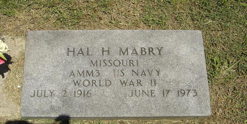 | MABRY, Hal Hamilton | July 2, 1916 | June 17, 1973 | Inscription: "MISSOURI AMM 3 US NAVY WORLD WAR II" - Research Note: Son of Hamilton S. Mabry and Hallie Eppes. His wife was Frances Virginia Rice. | Census Phyllis Long Photo BCG and HS |