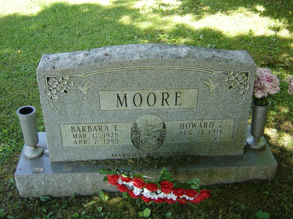 SSW: Barbara E. - Inscription: "Married Nov. 23, 1950" - Research Note: He was the son of Rufus C. and Mittie M. (Johnson) Moore. On November 23, 1950, in Cassville, he was united in marriage to Barbara E. Bradley, who preceded him in death on April 7, 1995. Also preceding him in death were his parents; one infant brother and sister and a grandson, David Leon Moore. Howard received his education at Horner School near Cassville. During World War II he entered the United States Army, service from October 21, 1943 until March 4, 1946. Most of his life was spent as a machinist for Rocket Dyne at Neosho. He was a member of Mill Street Church of Christ, Cassville. | Fohn Funeral Home Phyllis Long Photos BCG and HS |
