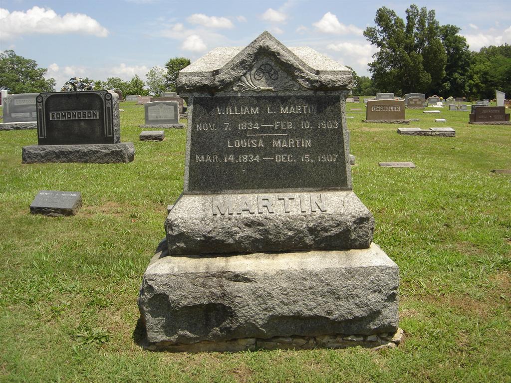 SSW: Louisa - Research Note: Goodspeed's 1888 History - William L. Martin, collector of Barry Co., MO, is a native of Lancaster Co., OH, born in 1834. He is a son of Jonathan and Elizabeth (Martin) Martin. Jonathan Martin was born of English and Irish parents, in Monroe Co., MI, in 1808. His father, William Martin, was a native of Canada, and served in the Revolutionary War. When about 8 years of age, Jonathan Martin went with his parents to Lancaster Co., OH. He learned the saddler's trade in Detroit, MI, and in 1836 removed to Carroll Co., IN, locating at Camden, after which he laid out a portion of the town. He died in March 1857. His wife was born in Lancaster Co., OH in 1807. She was a daughter of William Martin, a native of Ireland. Mrs. Martin died in 1869. She was the mother of 8 children, five of whom she reared to maturity. Those living are Peninah E. (wife of Samuel M. Gordon), William L., Benjamin W. (a saddler, of Columbus, KS), and Henry T. (a photographer, of Topeka, KS). When his parents removed to IN, William L. was but two years of age, and his education was secured in that State. He worked as an apprentice at the saddler's trade in Lafayette, IN for 2 years, after which he worked as a journeyman in various States for three years. In 1858 he wedded Louise Lennon, a daughter of John Lennon, and a native of Carroll Co., born in 1836. To them have been born five children: Charles C. (general agent for the Home Insurance Co., with headquarter at Pierce City), Henry A. (an engineer on the Atlantic and Pacific Railway in Arizona), Florence L. (her father's deputy collector), William H. (a saddler, who now has charge of his father's shop in Cassville; he is a graduate of a commercial college of Topeka, KS), and a son, who died in infancy. After his marriage, Mr. Martin located in Camden, and began working at his trade on his own responsibility. In Jan. 1961, he abandoned his trade because of ill health, and purchased a tan yard, which he operated for the next five years. From 1866 till 1872 he was engaged in farming in Cherokee Co. KS. Thence he removed to Cassville, and for a few months was engaged in saw milling, at the end of which time he established a harness shop, with which he has since been connected. In 1880 he was elected by the Democratic party, treasurer of the county, and in 1886 was elected to his present position. He is not a candidate for re-election, and at the expiration of his present term will devote his entire attention to his trade. His public as well as his private life is a stain, and he enjoys the confidence of the entire county. He is a member of the IOOF No. 298, of Cassville. - Footstone | Goodspeed Phyllis Long Photos BCG and HS |