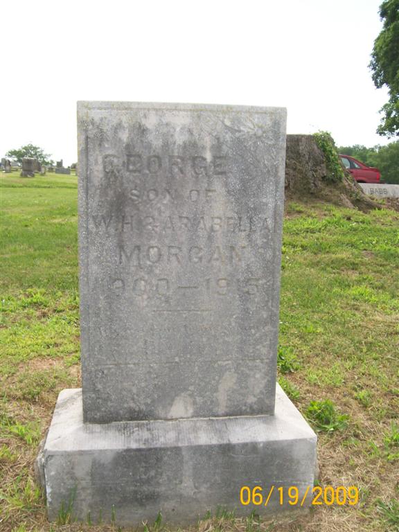 Inscription: "Son of W. H and Arabella Morgan" - Research Note: No birth date was given on his death certificate. His age was given as 15 years. He was a son of "Bud" Morgan, born AR, and Bell Ray, born Barry Co., MO. The cause of death was smallpox. | Death Certificate Phyllis Long |