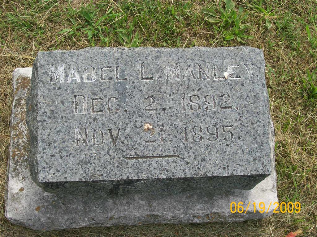 | MANLEY, Mabel L. | Dec. 2, 1892 | Nov. 21, 1895 | No Data - Manley Plot Stone | Photos BCG and HS |