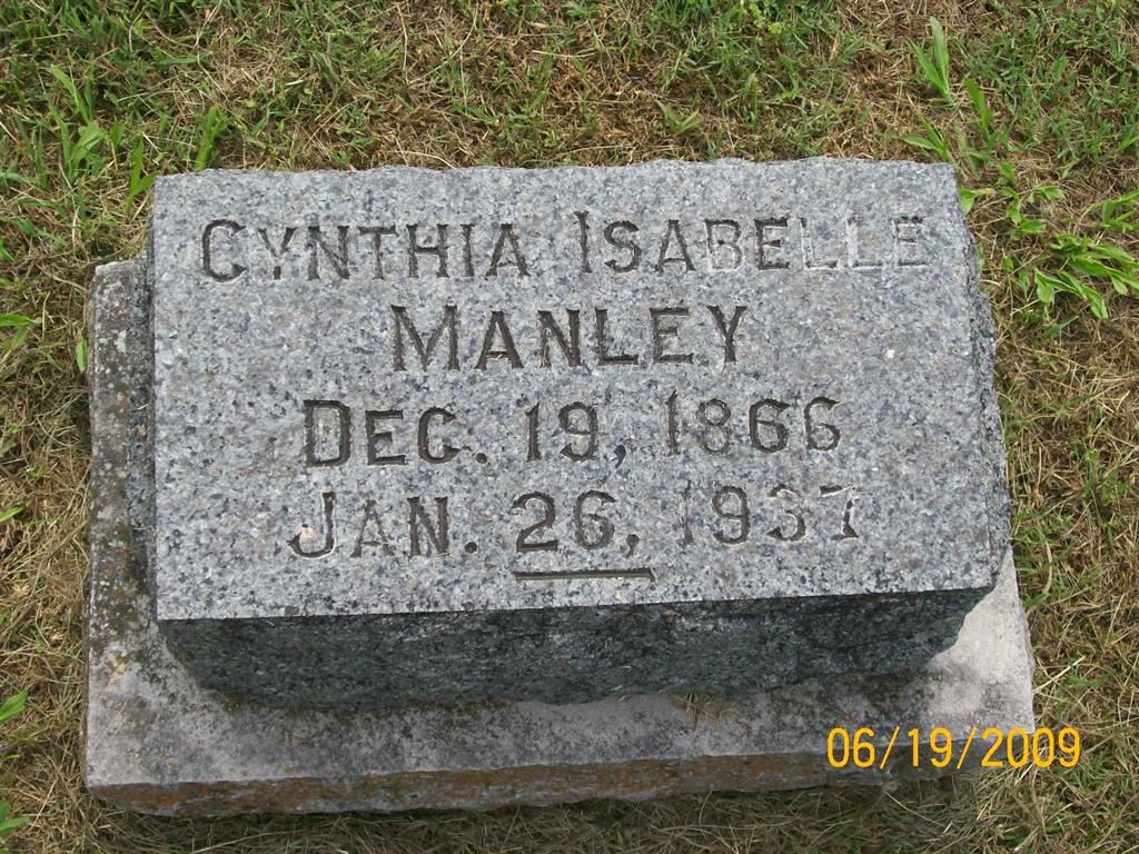 | MANLEY, Cynthia Isabelle "Belle" (GOODNIGHT) | Dec. 19, 1866 | Jan. 26, 1937 | Research Note: Wife of Charles D. Manley. Daughter of George Goodnight and Elizabeth McCoy, buried at Goodnight Cemetery. - November 6, 1913, Thursday, Cassville Republican - Mrs. Arthur Frost came in Tuesday morning from Oklahoma to visit her mother, Mrs. Elizabeth Goodnight and sister, Mrs. C. D. Manley. - December 9, 1915, Thursday, Cassville Republican - Personal and Local News: Mrs. C. D. Manley, daughter Miss Elaine, and little granddaughter, Vivian Manley, of Exeter, visited Mr. and Mrs. Lynn Manley, and the family of W. D. Steele at Monett Sunday. - Mother's Obit - Manley Plot Stone | Mother's Obit Online Newspapers Phyllis Long Photos BCG and HS |