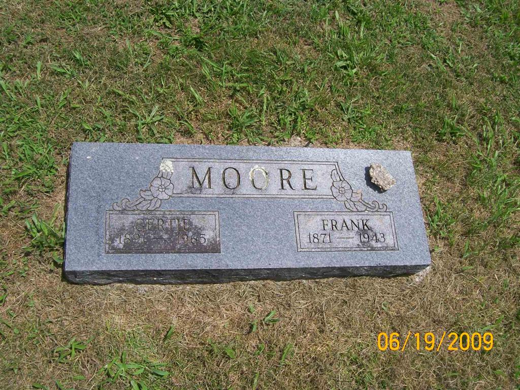 SSW: Gertie - Research Note: Frank S. Moore first married Mary E. Ashby on Dec. 1, 1889 in Barry Co., MO. He second married to Gertrude M. (Faulk) Robbins. Gertie Robbins and a son of William Jefferson "Jeff" Moore. His occupation was orchardist. Mrs. Lester Kissler of Cassville, MO was the informant. | Death Certificate MO Marriage Records Census Phyllis Long |