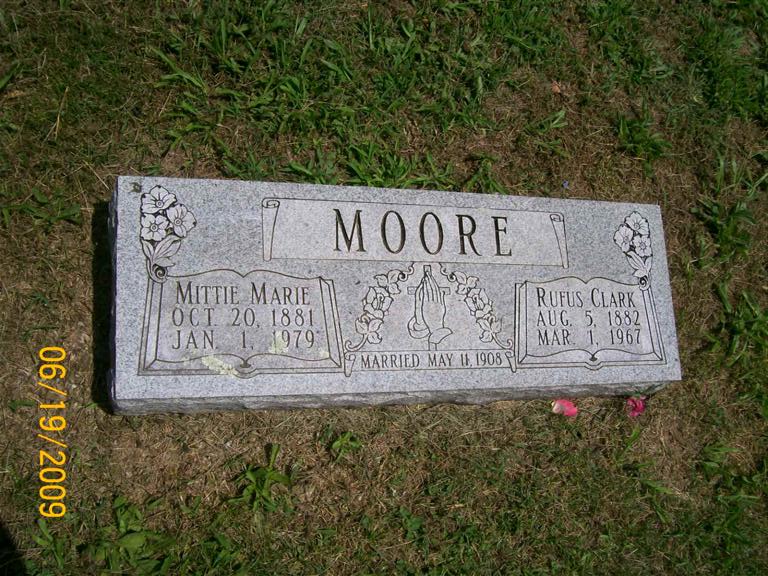 Jan. 1, 1979 | SSW: Rufus Clark - Inscription: "Married May 14, 1908" - Research Note: Daughter of Jackson B. Johnson and Mary C. Dunlop. Mittie Johnson, age 21, married Charles Bass, age 21, on Jan. 20, 1903 in Barry Co., MO. Mittie M. Johnson married Rufus C. Moore on May 11, 1908 in Carthage, Jasper Co., MO. | SS Claims Index MO Marriage Records Phyllis Long Photo BCG and HS |