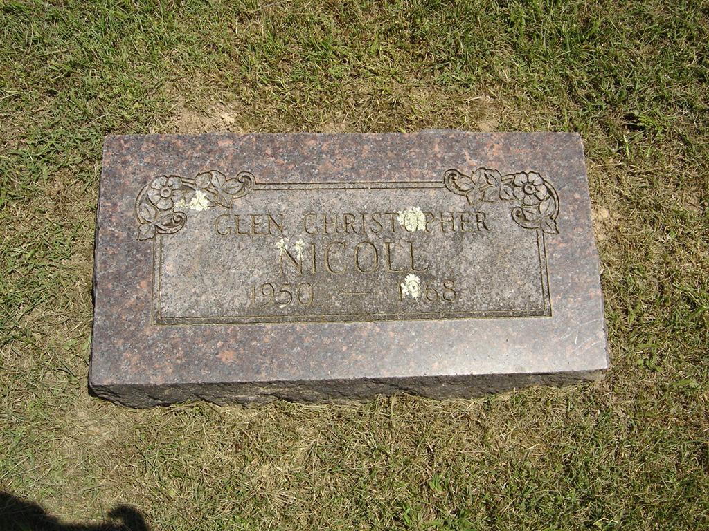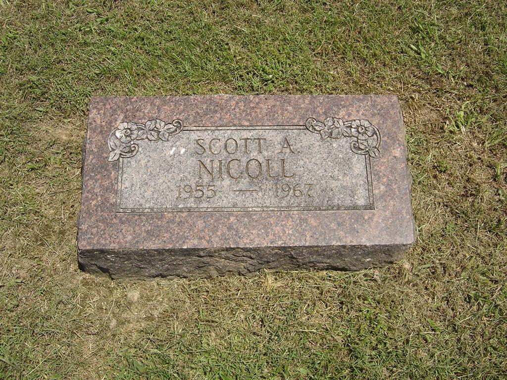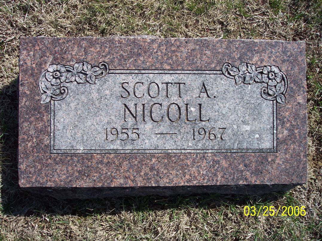 Research Note: Researcher Kay Cardin posted he died in Cassville but Culver's Funeral Home reads that he died in St. Vincent's Hospital, which was in Monett. Scott was a son of Glen Dale Nicoll and Helen Horine. He was 11 years old.- Another Photo | Headstone Kay Baker Cardin Photo Diana Cope Photo BCG and HS Culver Funeral Home, V. 12, P. 96, by Ted Roller Donna Cooper |
