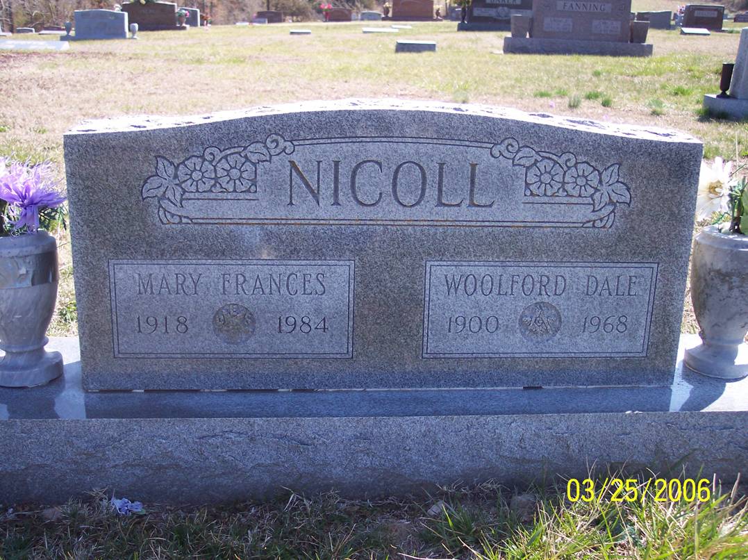 SSW: Mary Frances - Research Note: Son of David A. Nicoll and Mary Thomasine Meekins. Glen D. Nicoll of Cassville, MO was the informant on the death certificate. - Another Photo | Census Death Certificate Phyllis Long Headstone Kay Baker Cardin Photo Diana Cope Photo BCG and HS |