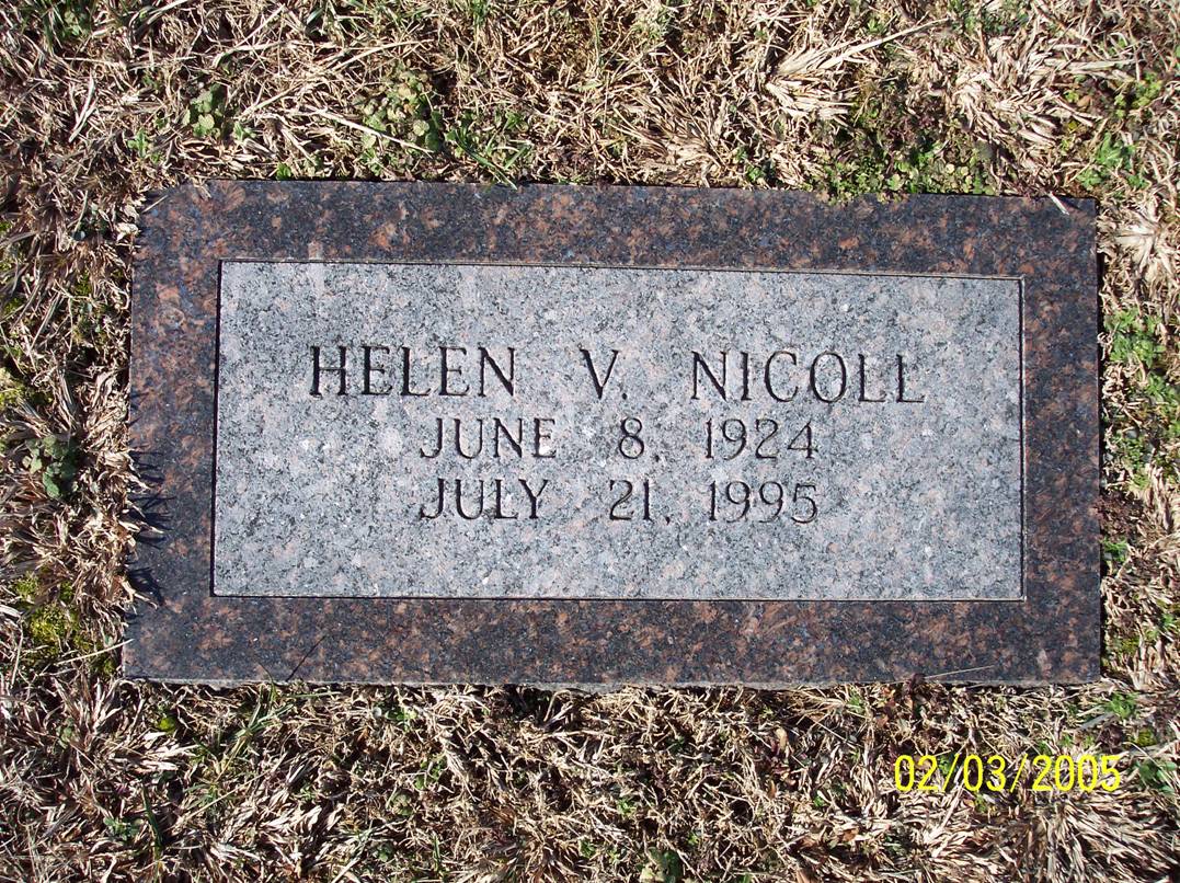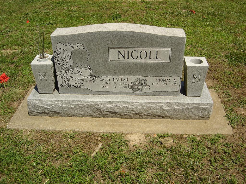 | NICOLL, Thomas Alexander | Dec. 29, 1929 | Mar. 15, 1990 | SSW: Sally Nadean - Inscription: "Mar. 29, 1981" - Research Note: Son of Woolford Dale Nicoll and Mary Frances Alexander. | Census Phyllis Long Photo BCG and HS |