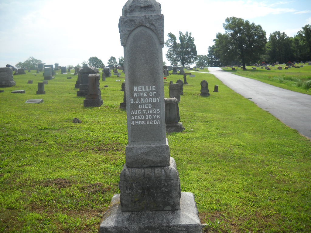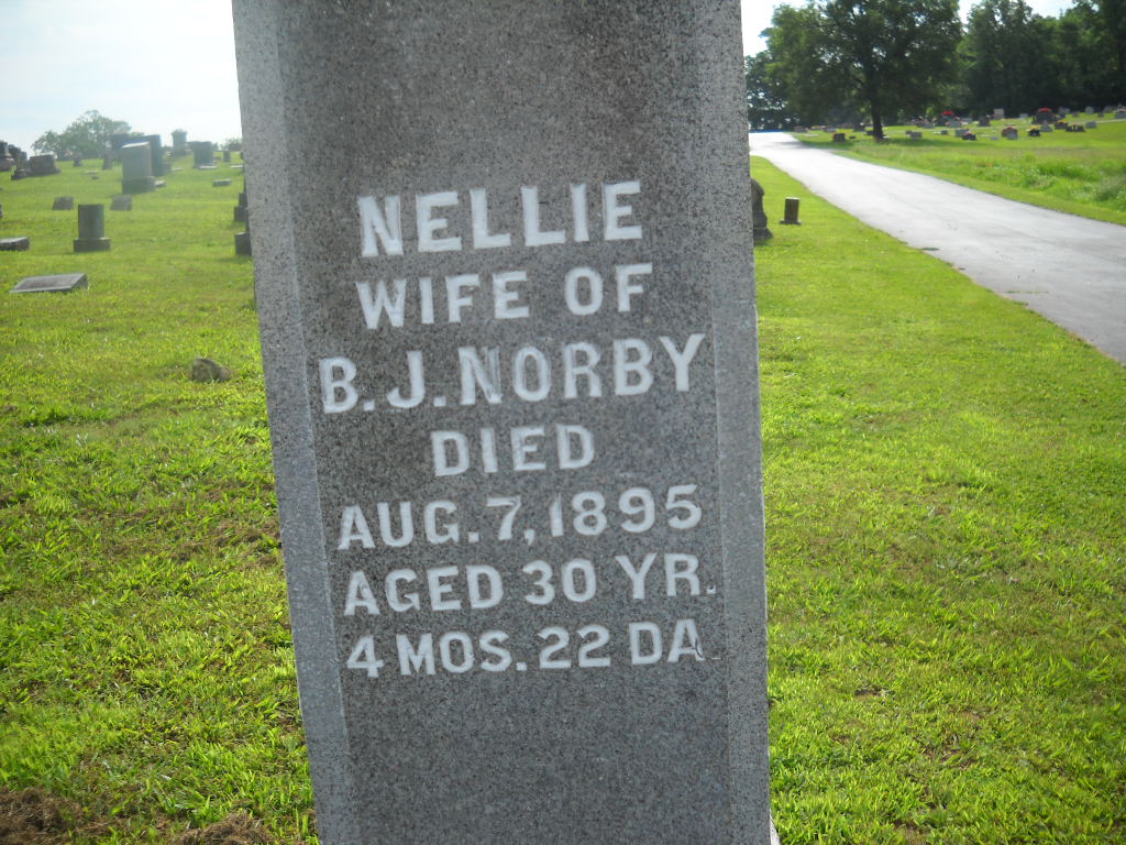 | NORBY, Nellie (MEHUS)) | Abt. 1866 | Aug. 7, 1895 | Inscription: "Nellie - Wife of B. J. Norby, Aged 30 Yr. 4 Mos. 22 DA." - Research Note: Daughter of Ole and Margaret Mehus. Nellie Mehus, age 25, married Benjamin J. Norby on Jan. 2, 1893 in Freeborn, MN. - Freeborn County Standard, Aug. 14, 1895, Albert Lea, Minnesota - Word has been received here of the death, Aug. 6, in MO of Mrs. B. J. Norby, formerly Miss Nellie Mehus, of this city. - Another Photo | Newspaper Item MN Marriage Records Phyllis Long Photos BCG and HS |