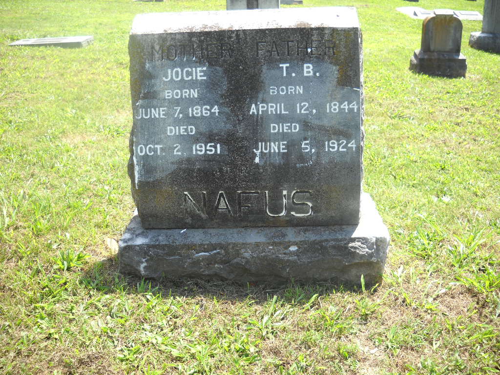 SSW: Jocie - Inscription: "Father" - Research Note: His son, Emmett Ray Nafus, was buried in Oak Ridge Cemetery. His death certificate reads that his father's name was Thomas Benton. - Son of Cornelius Nafus and Sarah Amelia Wilmarth. - 1880 Census, Pleasant Gap, Bates, Missouri - Cornelius Nafus, age 72, farmer, born KY; Sarah, wife, age 73, born KY; Benton, son age 32, born MO; Marion, son, age 2, born MO; Sterling Smith, age 18, orphan, born MO; Lee Smith, age 18, orphan, born MO. - 1910 Census, Flat Creek Twp., Barry County, MO - Nafus, Thomas B., Head, Male, age 56, Married 33 years, born MO, father born IN, mother KY; Josie, Wife, F, 47, M 33, MO IA MO; Andrew J., Son, M, 23, Single, AR MO MO; Emmet R., Son, M, 18, S, MO MO MO; Fannie M., Daughter, F, 15, S, MO MO MO; Grace B., Daughter, F, 13, S, MO MO MO; Minnie E., Daughter, F, 10, S, MO MO MO; Albert G., Son, M, 7, S, MO MO MO; Ethel, Daughter, F, 4, S, MO MO MO. - October 30, 1913, Thursday, Cassville Republican - Quaker News: T. B. Nafus and family returned home Sunday from Oklahoma where they had been visiting for two weeks. - February 7, 1918, Cassville Republican - Mrs. Clarence Oakley of Colorado is visiting her father, T. B. Nafus and family. - Cassville Democrat, Oct. 23, 1920 - Miss Minnie Nafus a daughter of Mr. and Mrs. T. B. Nafus residing northeast of this city, was dangerously sick last week from effects of ptomaine poisoning but is recovering. - Same Paper - Andrew Nafus and wife have been attending his sister, Miss Minnie of near Oak Ridge, who has been seriously sick. | Photo BCG and HS Death Certificate Donna Cooper Census Online Newspapers Phyllis Long |