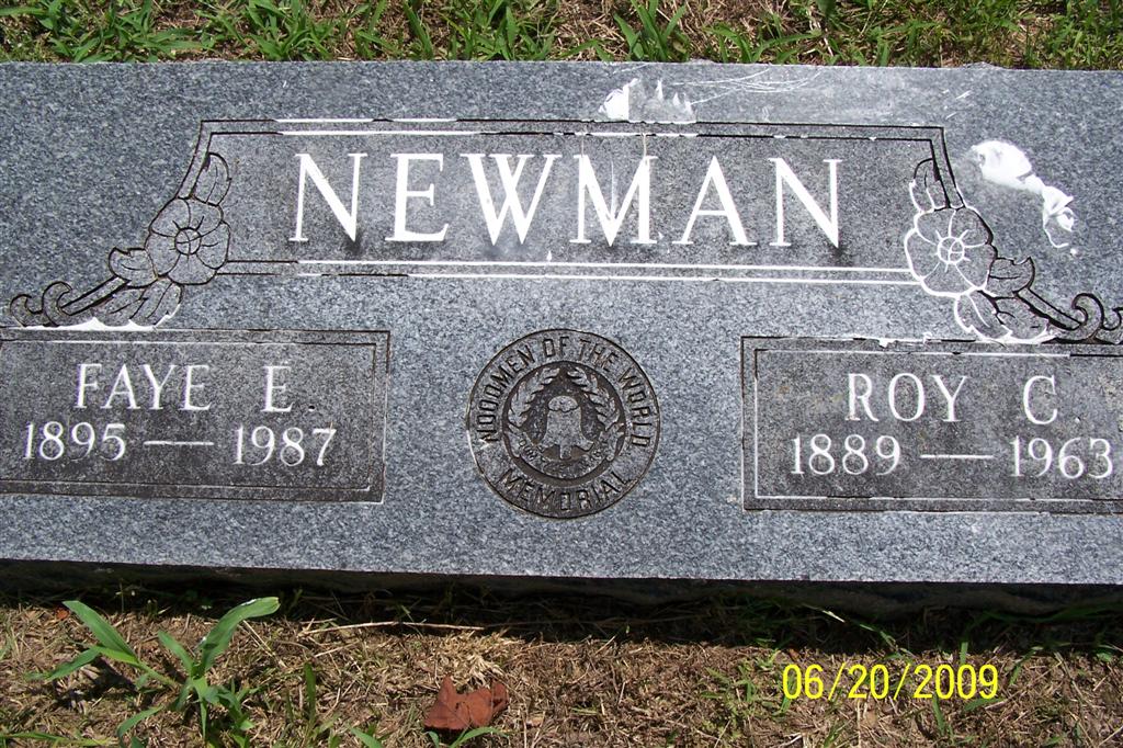 SSW: Roy Chesley - Inscription: "Woodmen of the World" - Research Note: Daughter of Joseph Marion Garner and Martha Melvina Henrietta Ernst. - August 1, 1912, Thursday, Cassville Republican - Roy Newman and Miss Fay Garner were united in marriage Sunday afternoon at the home of Neil Robbins south of town. J. S. Platttenburg performed the ceremony. Mr. Newman is a son of Sheriff and Mrs. M. E. Newman of this city. He is deputy sheriff of Barry County and is discharging the duties well. He has practically lived in Cassville all his life and is highly respected by all who know him. The bride is the daughter of Mrs. J. M. Garner of this city. She is a young lady with many accomplishments and has many friends in Cassville. They will make their home in Cassville. | Online Newspapers Phyllis Long Photo BCG and HS |