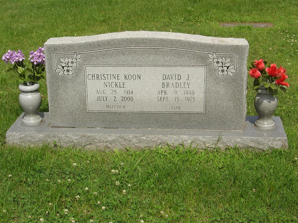 SSW: David J. Bradley (son) - Inscription: "Mother" - Research Note: She was the daughter of William D. and Virginia M. (Bugg) Koon. She was employed in doctor's offices for a short time and worked as city collector of Cassville for several years. For 30 years she sold World Books in Barry County and the surrounding area. She was married to Burl Wilson Bradley, and later married Cliff Nickle, who preceded her in death. She was preceded in death by one son, David Bradley. - Another Photo | Monett Times July 6, 2000 Mary Homesley Photos BCG and HS |