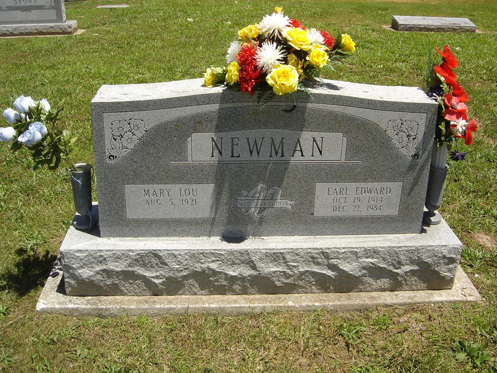 | NEWMAN, Earl Edward | Oct. 19, 1914 | Dec. 22, 1984 | SSW: Mary Lou - Inscription: "Wed July 13, 1939" - Research Note: Son of Roy Chesley Newman and Faye Edith Garner. | Census Phyllis Long Photo BCG and HS |