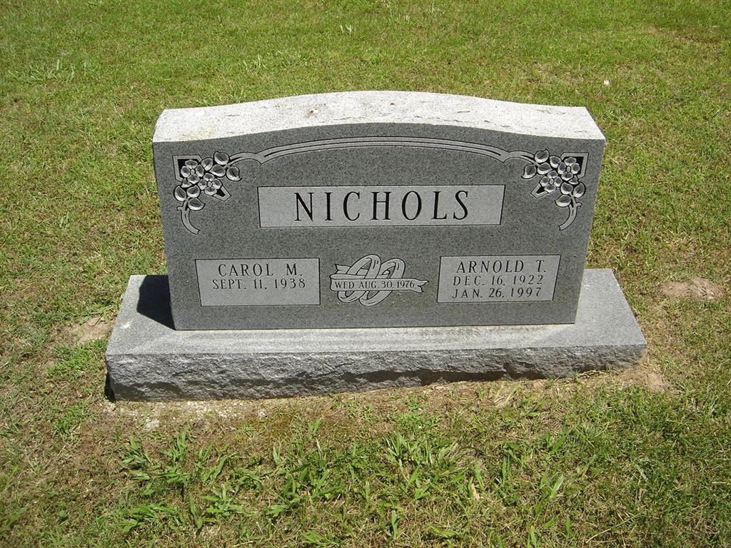 SSW: Arnold - Inscription: "Wed Aug. 30, 1976" - Research Note: Daughter of George Dewey and Viola (Cross) Levick. On Aug. 30, 1976 in Miami, OK she was united in marriage to Arnold "Nick" Nichols, who preceded her in death on Jan. 26, 1997. Also preceding her in death were her parents; second husband, Fred Baughman; two sons, James Lomax, Jr. and Kip Church; a grandson, Gregory Sparks; two brothers; four sisters; four special friends, Bernice, Barbara, Francis and Karlene and her beloved Boston Terrier, Logan. Surviving are one daughter, Madonna Sparks of Cassville, Missouri; eight grandchildren; nine great grandchildren; three great-great-grandchildren and several nieces and nephews. Carol graduated from high school. She was a homemaker and had lived in this area since 1972. Carol welcomed everyone with open arms, and had a big heart filled with love to share with anyone that was lucky enough to have known her. She loved babysitting, listening to country music, dancing, playing cards, karaoke, watching scary movies and going to yard sales, but most of all she loved spending time with her family and friends. Carol will be missed greatly by all who knew her. | Fohn Funeral Home L. Pearce FindaGrave Photos BCG and HS |