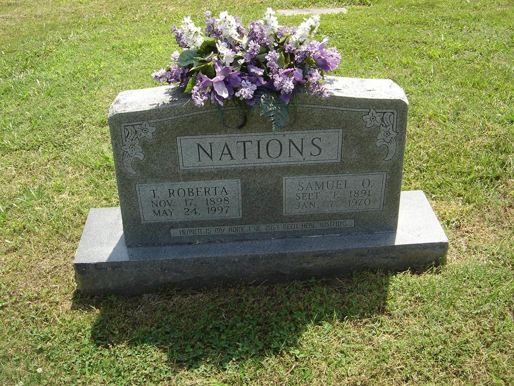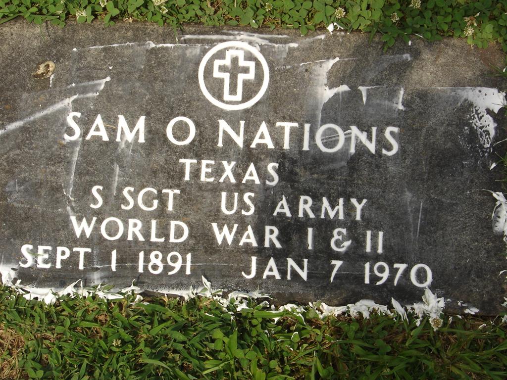 SSW: Tommie Roberta - Research Note: He was a son of Samuel Meadows and Mary Ellen (Baggett) Nations. His wife was Tommie Roberta Joyce. J. B. Nations of Cassville, MO was the informant on the death certificate. - Military Stone - Military Stone - Inscription: "TEXAS - S SGT US ARMY WORLD WAR I and II" | Death Certificate Phyllis Long Census Donna Cooper Photo BCG and HS |