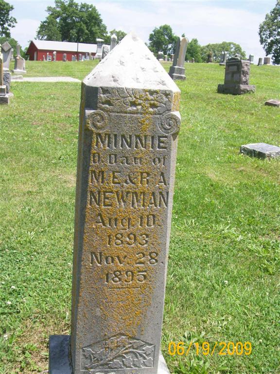 | NEWMAN, Minnie O. | Aug. 10, 1893 | Nov. 28, 1895 | Inscription: "Dau. of M. E. and R. A." - Research Note: Daughter of Marshall Edward Newman and Ruthie Snow. | Note Phyllis Long Photo BCG and HS |
