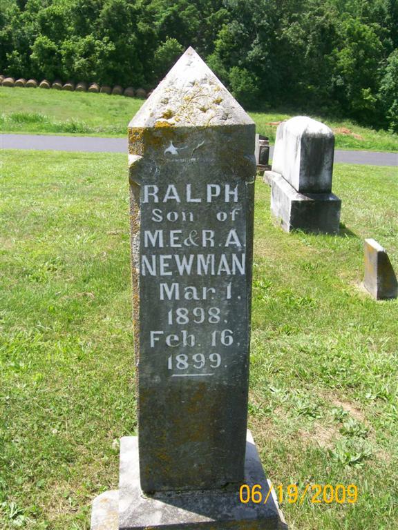 | NEWMAN, Ralph | Mar. 1, 1898 | Feb. 16, 1899 | Inscription: "Son of M. E. and R. A." - Research Note: Son of Marshall Edgar Newman and Ruthie Snow. | Note Phyllis Long Photo BCG and HS |