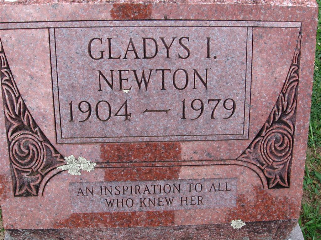 | NEWTON, Gladys I. | Mar. 3, 1904 | Sept. 1979 | Inscription: "An Inspiration To All Who Knew Her" | Photo BCG and HS |