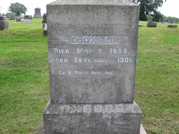 Inscription: "L. D. Oxford - Died Mar. 8, 1898, aged 58 ys, 11 Mos. 12 Ds - Co K First Ark. Inf." - Research Note: L. D. was the 2nd husband of Sarah Jane (Calton) Betterton, my Great-Grandmother. His first wife was Parthenia Horton. - According to the 1880 census and the 1890 Vet. census, he was blind. Son of Jacob Oxford and Rebecca Goodwin. - Oxford Family | Stone Note Shairon Betterton Allen Census Phyllis Long Photo BCG and HS |