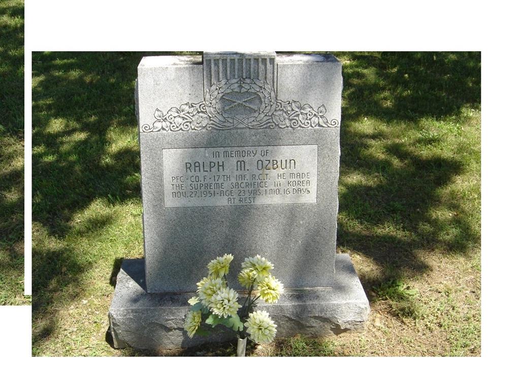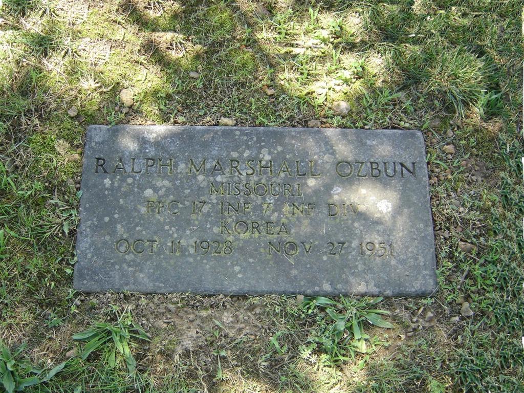 Inscription: "MISSOURI PFC 17 INF 7 INF DIV KOREA" - Research Note: Son of John Marshall Ozbun and Mary Katherine Writer. - Cassville Republican, March 6, 1952 - Military honors were given by the Irwin-Easley Post of the American Legion here yesterday afternoon at the final rites for Pfc. Ralph Ozburn, who was killed in action November 27, 1951, in the Korean war. The body of Pfc. Ozbun arrived at the Frisco station in Exeter Monday night of this week from overseas. Funeral services were held at the Culver Funeral Chapel here at 2:00 o'clock with the Rev. Calvin E. Henderson officiating, and Military rites were held at the graveside in Oak Hill cemetery. Surviving are his mother, Mrs. John Powell and step-father, John Powell and step-brother, John Powell of Cassville; three half-sisters, Mrs. Ray Cummons and Miss Jewell Ozburn of Kansas City and Miss Maxine Powell of the home. The obit has his both Ozburn and Ozbun in the spelling. - Joplin Globe, Mar. 1, 1952 - The body of PFC Ralph Ozbun, 23 years old, who was killed Nov. 27 in Korea, will arrive Monday night at Exeter and will be received by the Culver funeral home of Cassville. Surviving are his mother, Mrs. Tom Powell of Cassville and three sisters, Mrs. Ray Cummons and Miss Jewell Ozbun of Kansas City and Miss Maxine Ozbun of the home. Funeral services will be held at 2 o'clock Wednesday in the Culver chapel with the Rev. Calvin Henderson officiating. Burial will be in Oak Hill cemetery in Cassville. - Another Photo | Online Obit Barbara Erwin Joplin Globe Phyllis Long Photo BCG and HS |