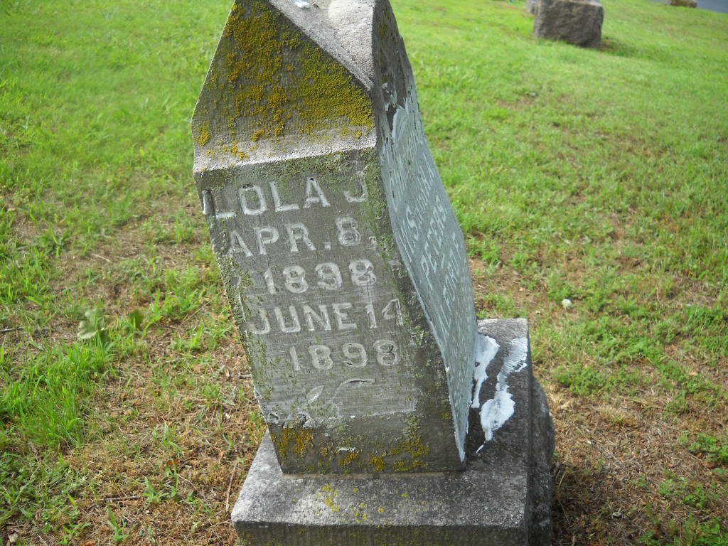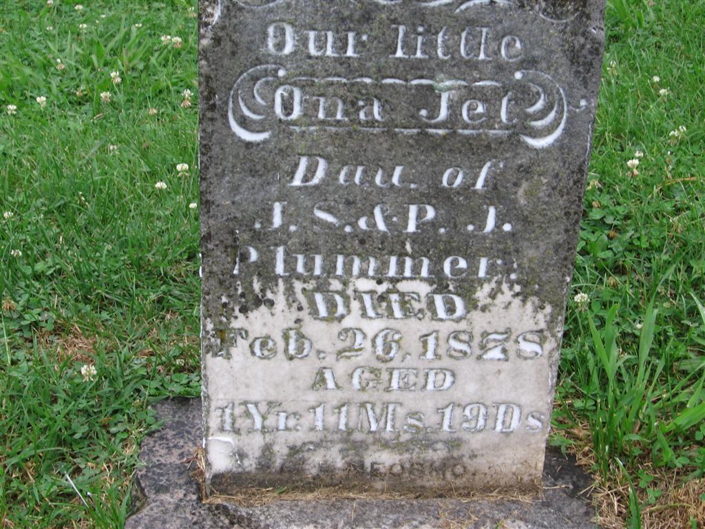 | PLUMMER, Ona Jel | No Date | Feb. 26, 1878 | Inscription: "Dau. of J. S. and P. J. - Age 1 Yr. 11 Ms. 19 Ds" - Research Note: Daughter of Dr. J. S. Plummer and Paulina Jane Walker. | Note Phyllis Long Photo BCG and HS |