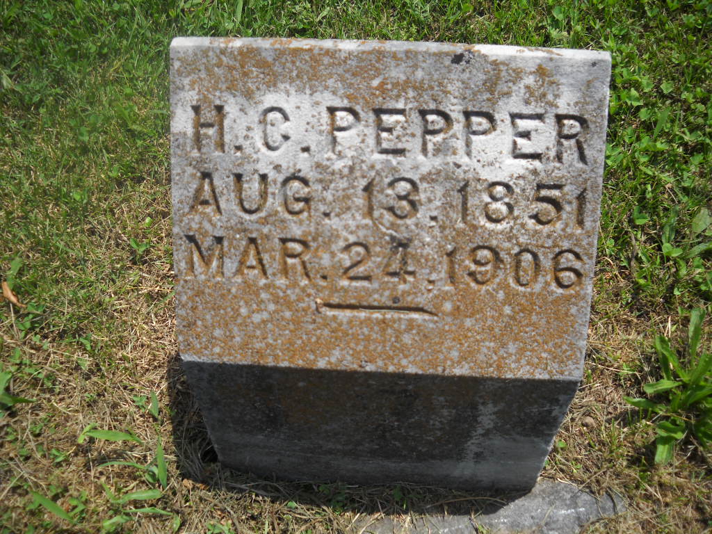 Mar. 24, 1906 | Research Note: Son of Joseph Pepper and Malinda Peace. Henry C. Pepper married Adrenia "Renna" Wilson on Oct. 5, 1890 in McDonald Co., MO. Renna second married John M. Clark and died in TX. - Cassville Republican, Thursday, May 31, 1894 - H. C. Pepper is improving his home property by erecting a meat smoke house. - Cassville Republican, Barry Co., MO, Thursday, June 28, 1894 - Miss Della Wilson, who had been visiting her sister, Mrs. H. C. Pepper, for several weeks past, returned home to Pineville Monday. - Mar. 23, 1899, Cassville Republican - Judge Pepper bought Dr. Coppedge's ten acre field on the hill Tuesday for $350. - March 31, 1906, Cassville Democrat - Ben Pepper and wife of Pineville came over Tuesday to attend the funeral of his brother, the late Judge Henry C. Pepper. - April 7, 1906, Cassville Democrat - Rock Springs News: We were sorry to hear of the death of Judge Pepper and join with the relatives and friends in mourning. - Cassville Republican, Thursday, Nov. 14, 1918 - Charles Wilson, a former Cassville boy, died in Joplin last week of pneumonia, at the age of 29 years. He lived in Cassville for a few years while a boy at the home of his brother-in-law, the late Judge H. C. Pepper, and many friends in Cassville. He leaves wife, father and two sisters, Mrs. Pepper and Mrs. Della Chenoweth of Pineville. - July 24, 1920, Cassville Democrat - C. C. Akin a prominent attorney of Claremore, Okla., was in this city Saturday. He is an own cousin to the late Judge H. C. Pepper formerly of this city and who died several years ago. They were former partners in the practice of law at Mound City, Mo., years ago. Mr. Akin is candidate for county attorney in his home county and we wish him success, because he evidently possesses the necessary qualifications. - Pepper Plot Stone | Online Newspapers MO Marriage Records Census Phyllis Long Photos BCG and HS |