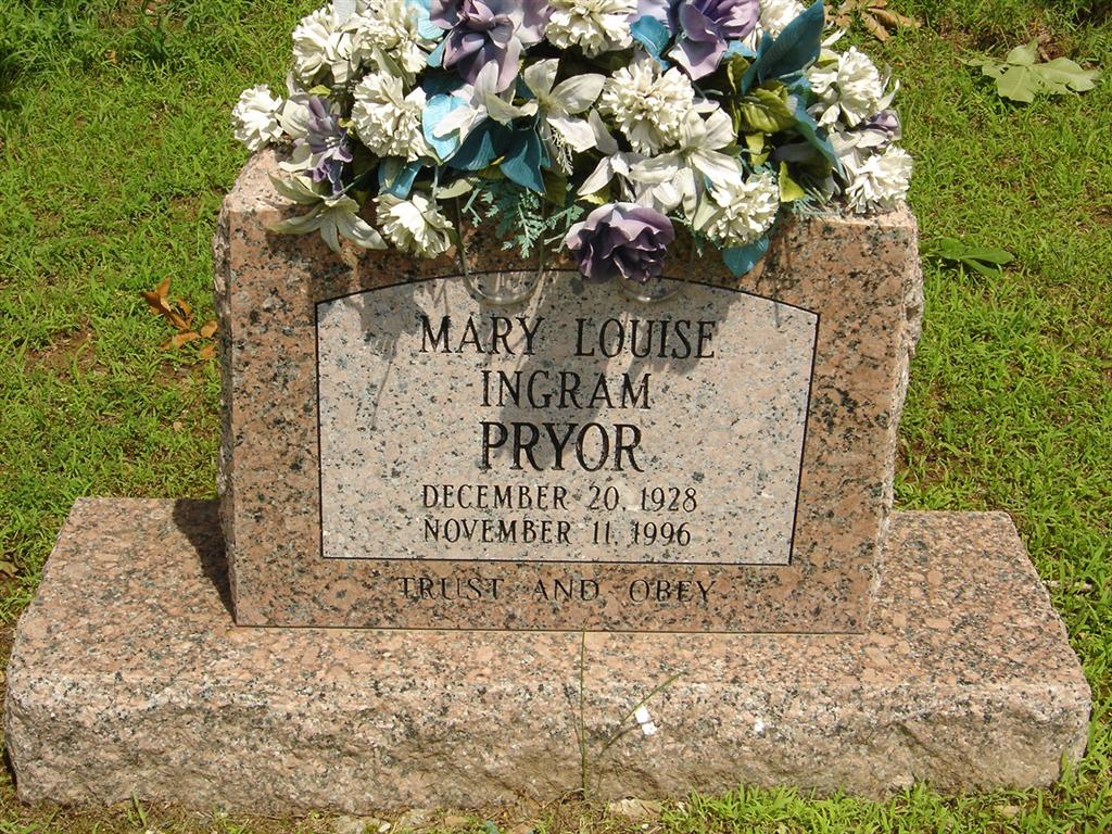 Nov. 11, 1996 | Inscription: "Trust And Obey" - Research Note: Daughter of John S. Ingram and Gladys P. Horine. Mary Louise Ingram, age 21, from Tulsa, OK, married William E. Pryor, age 22, from Camden, Ouachita Co., AR, on Aug. 26, 1950 in Ouachita Co., AR. | SS Claims Index AR Marriage Index Phyllis Long Photo BCG and HS |