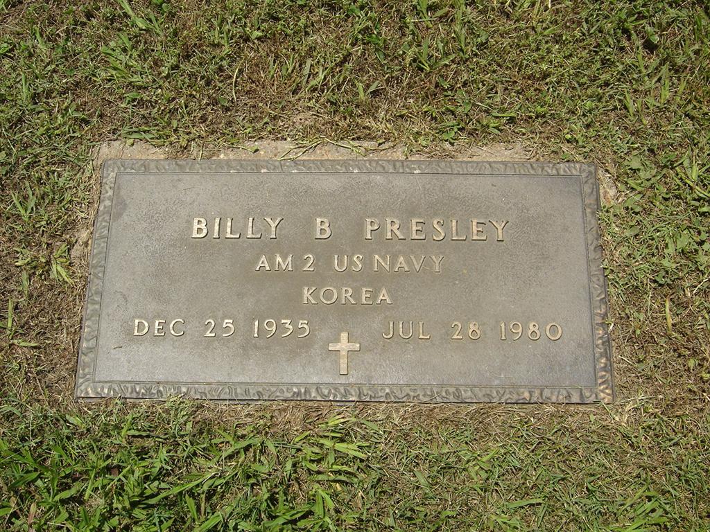 Inscription: "AM 2 US NAVY KOREA" - Research Note: Son of Allen B. Presley and Lorraine Coger. - Presley Plot Stone | NV Death Index SS Claims Index Phyllis Long Photos BCG and HS |