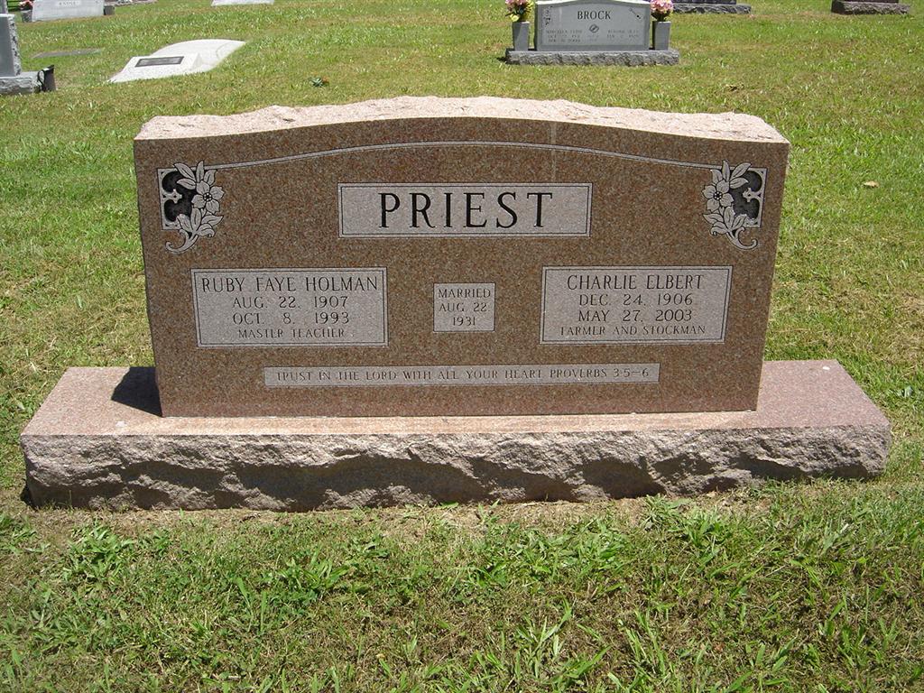 | PRIEST, Ruby Faye (HOLMAN) | Aug. 22, 1907 | Oct. 8, 1993 | SSW: Charlie Elbert - Inscription: "Married Aug. 22, 1931" - Research Note: Daughter of William H. Holman and Samantha Cleo Chappell, both buried at Oak Hill Cemetery. | Note Phyllis Long Photo BCG and HS |