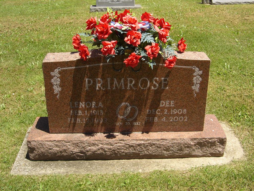 SSW: Lenora - Inscription: "July 20, 1932" - Research Note: Age 93 years. Herbert "Dee" Primrose, 93, of Cassville, died at 12:50 p.m. yesterday, February 4, at Red Rose Inn in Cassville. Mr. Primrose was a retired automobile dealer. The services will be 10 a.m. Friday, February 8, at Williamson Chapel in Cassville. Burial will be in Oak Hill. Son of John Henry Connolly Primrose and Gertrude Wardlaw. | Monett Times Feb. 5, 2002 Mary Homesley Monett Times Feb. 5, 2002 Census Phyllis Long Photo BCG and HS |