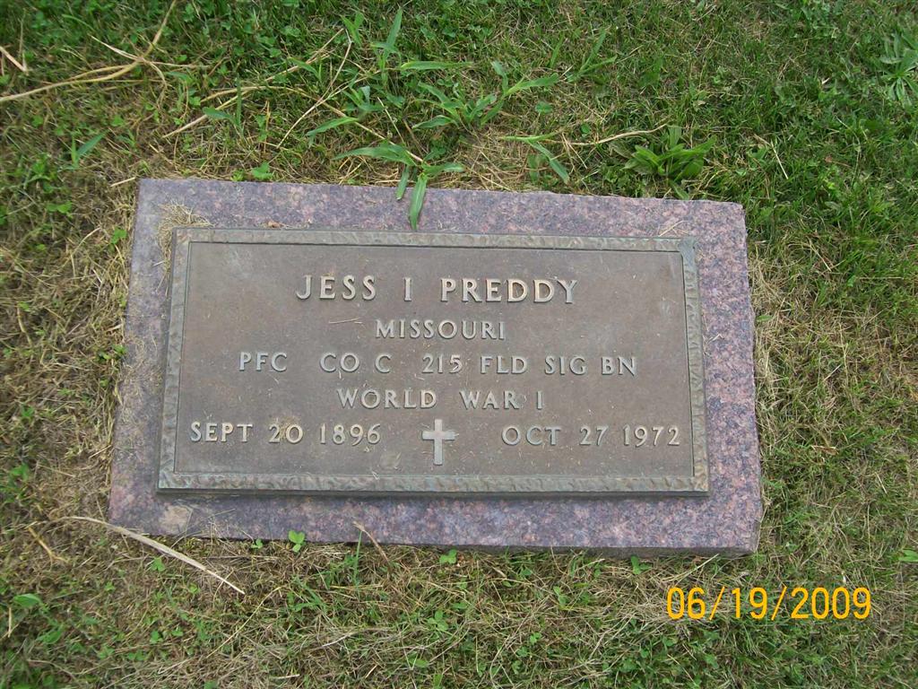 Inscription: "MISSOURI - PFC CO C 215 FLD SIG BN WORLD WAR I" - Research Note: His parents were given as George Frank Preddy and Halide Linville in the Culver Funeral Home records. He was given as married and his wife was listed as Ima White Preddy. - Cassville Democrat, Saturday, Feb. 28, 1920 - Jess Preddy is all over in smiles, because a little son arrived at his home, Feb. 24. The granddaddy Joe White, languished on the banks of sweet deliverance and will recover. - July 17, 1920, Cassville Democrat - G. B. Reese, Vic Erwin, Jess Preddy and Russell Horner left Wednesday morning for Colorado, by auto. | Photo BCG and HS Culver Funeral Home, V. 15, P. 50, by Ted Roller Donna Cooper Online Newspapers Phyllis Long |