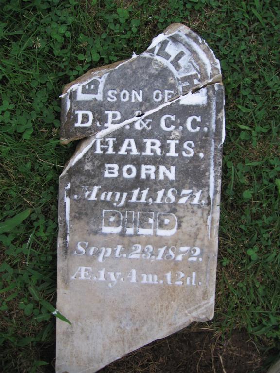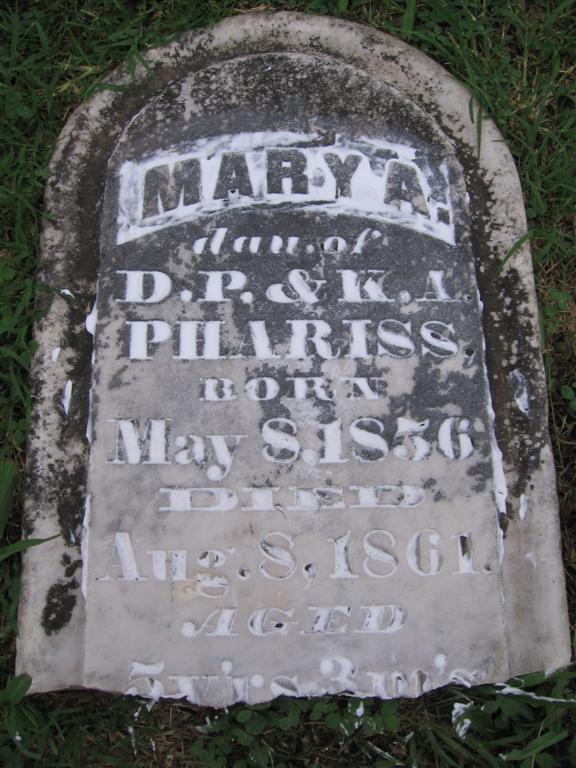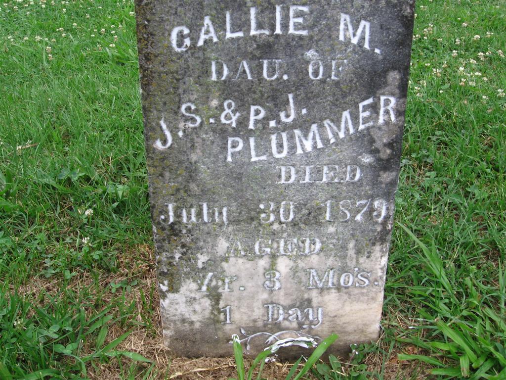 | PLUMMER, Callie M. | No Date | July 30, 1873 | Inscription: "Dau. of J. S. and P. J. - Age 1 Yr. 3 Mo's 1 Day" - Research Note: Daughter of Dr. J. S. Plummer and Paulina Jane Walker. The date could be 1879, but appears to be a 3 compared to the other 3's on the stone. | Note Phyllis Long Photo BCG and HS Note Donna Cooper |