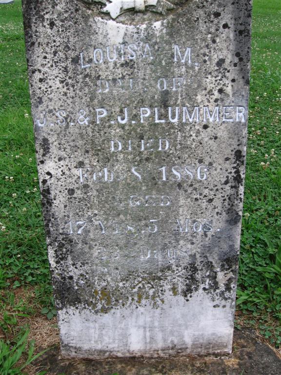 | PLUMMER, Louisa M. | No Date | Feb. 8, 1886 | Inscription: "Dau. of J. S. and P. J. - Age 17 Yrs. 5 Mo's. 23 Days" - Research Note: Daughter of Dr. J. S. Plummer and Paulina Jane Walker. | Note Phyllis Long Photo BCG and HS |