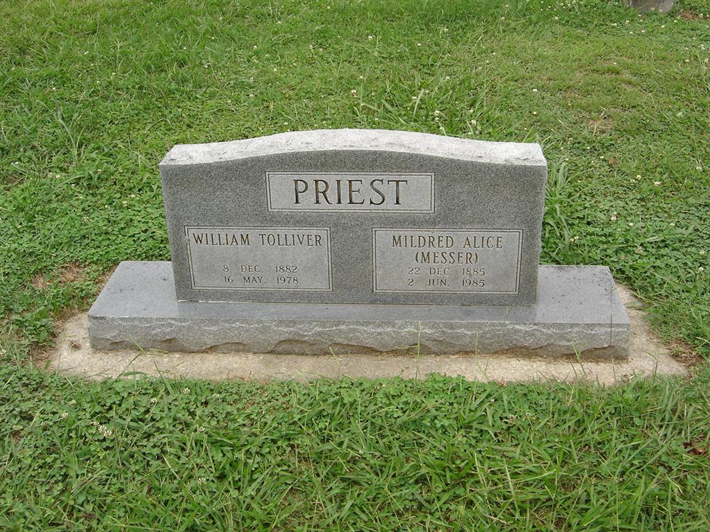 | PRIEST, Mildred Alice (MESSER) | Dec. 22, 1885 | June 2, 1985 | SSW: William Trolliver Priest - Research Note: Mildred was a daughter of Melville C. and Mary (Bayless) Messer. - June 30, 1917, Saturday, Cassville Democrat - Local And Personal: Miss Nannie Robbins and niece Miss Minerva Current of Siloam Springs, Ark., visited her nephew W. T. Priest and family this week. - Cassville Republican, Thursday, Sept. 19, 1918 - W. T. Priest was over Thursday from Joplin after his household goods. Mrs. Priest and little son, Melvin, accompanied him upon his return. - Cassville Republican, Thursday, Oct. 24, 1918 - Mrs. W. T. Priest and little son, Melvine, of Joplin, have been visiting Mrs. Priest's mother, Mrs. Mollie Messer. - Father's Obit- Another Photo | Photos BCG and HS Family knowledge Judy Wilson Online Newspapers Phyllis Long |